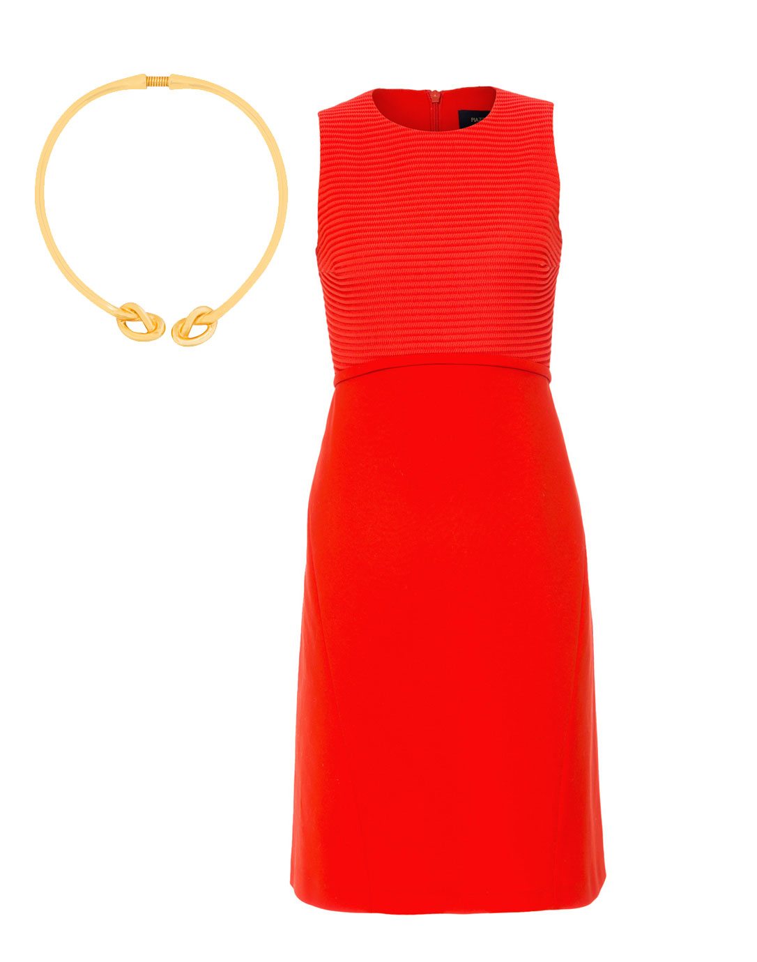 PIAZZA SEMPIONE Mandarin Red Ottoman Ribbed Stretch Cotton Dress, $975; KENNETH JAY LANE Gold Rope Knot Twist Collar Necklace, $125; both available through Halsbrook.com.