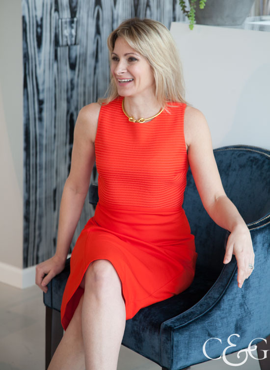 ‘This LK Bennett skirt is amazing,’ says Schroeder. ‘It adds both a pop of color and texture to any outfit. We paired with a silk shirt and gold jewelry to give the outfit a timeless look.’