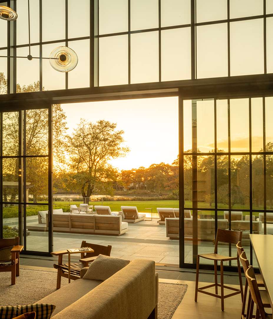 Lead by partner Tom McNeill, AIA, the team was first and foremost focused on bolstering the spirit of the structure and its connection to the landscape. Following its form and past life as a car barn, they kept the floorplan open and voluminous, which naturally lead the project towards a minimalist, organic design. McNeill opened up the walls and filled them with glass, which highlighted the existing gable roof and expanded the views.