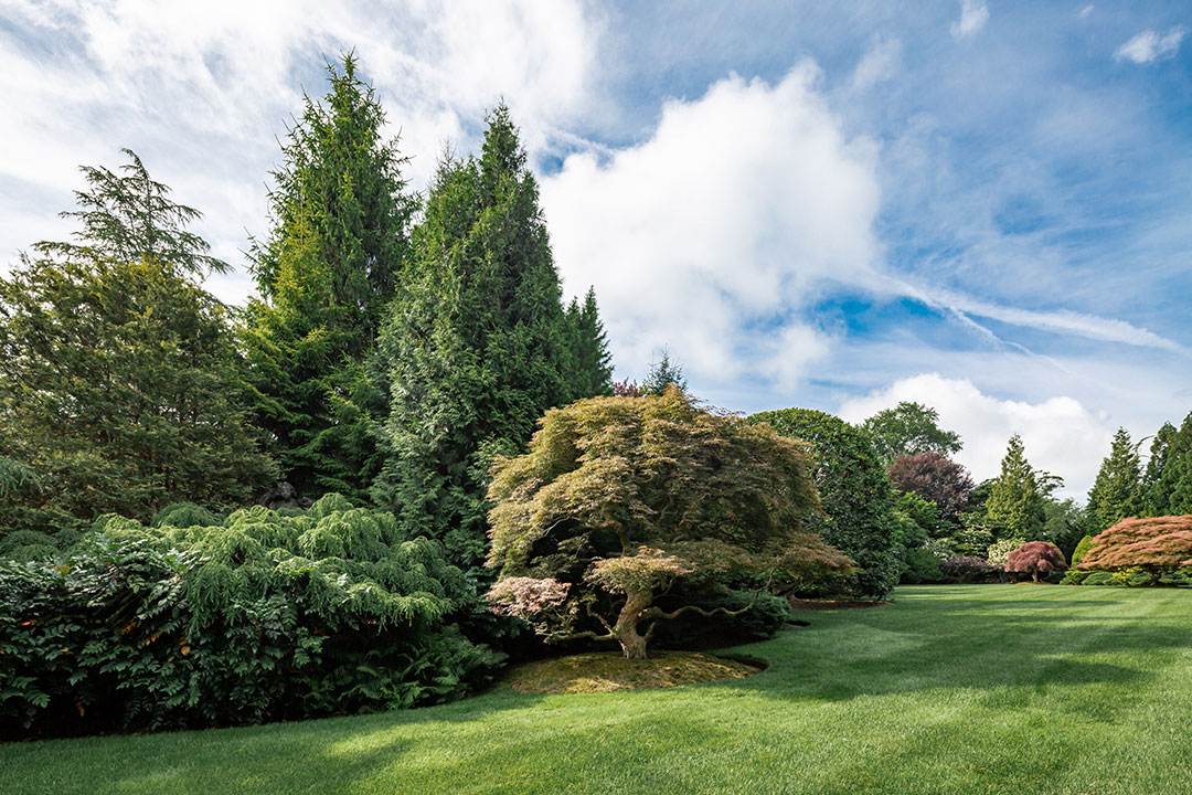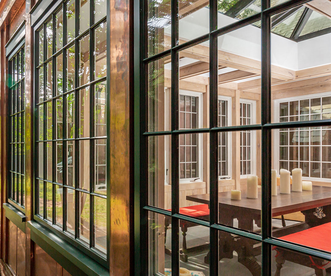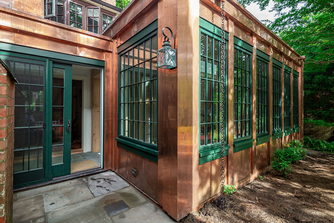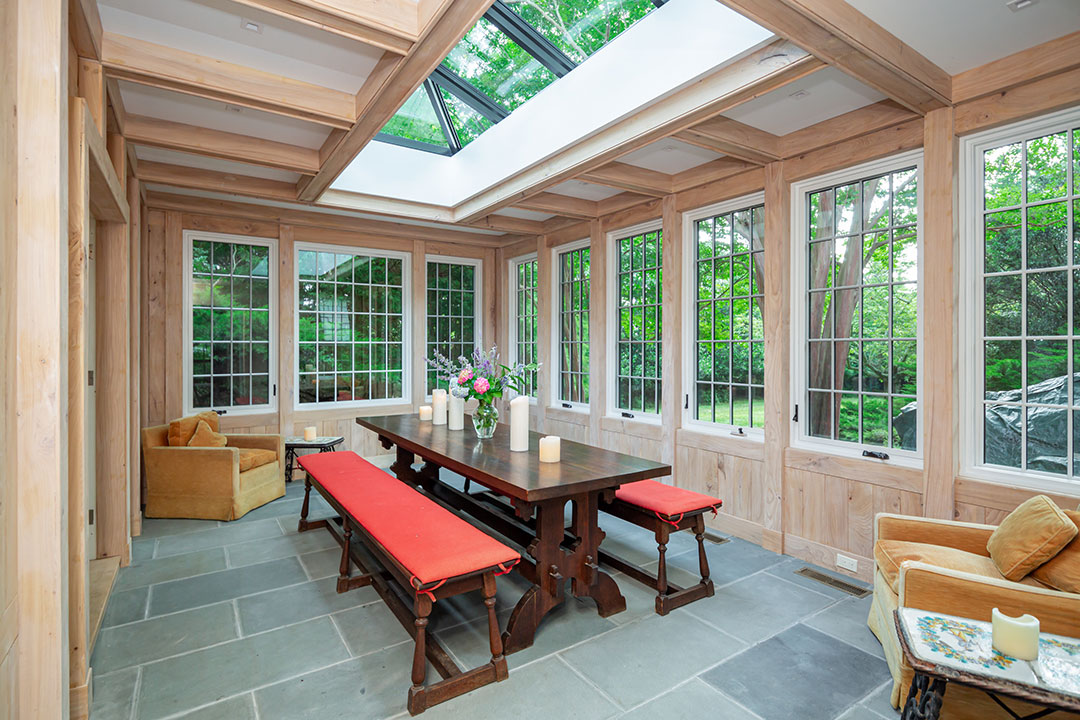 Vaulted ceilings reach 40-feet, allowing for plenty of natural light and providing a grand space. More recently, a copper-clad conservatory has been added to the footprint and the kitchen has been renovated. Plenty spacious for weekend hosting, the 6,000-square-foot abode totals five bedrooms and five full bathrooms.