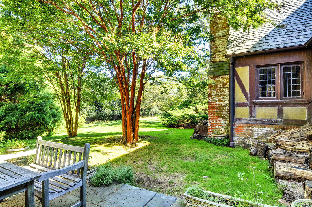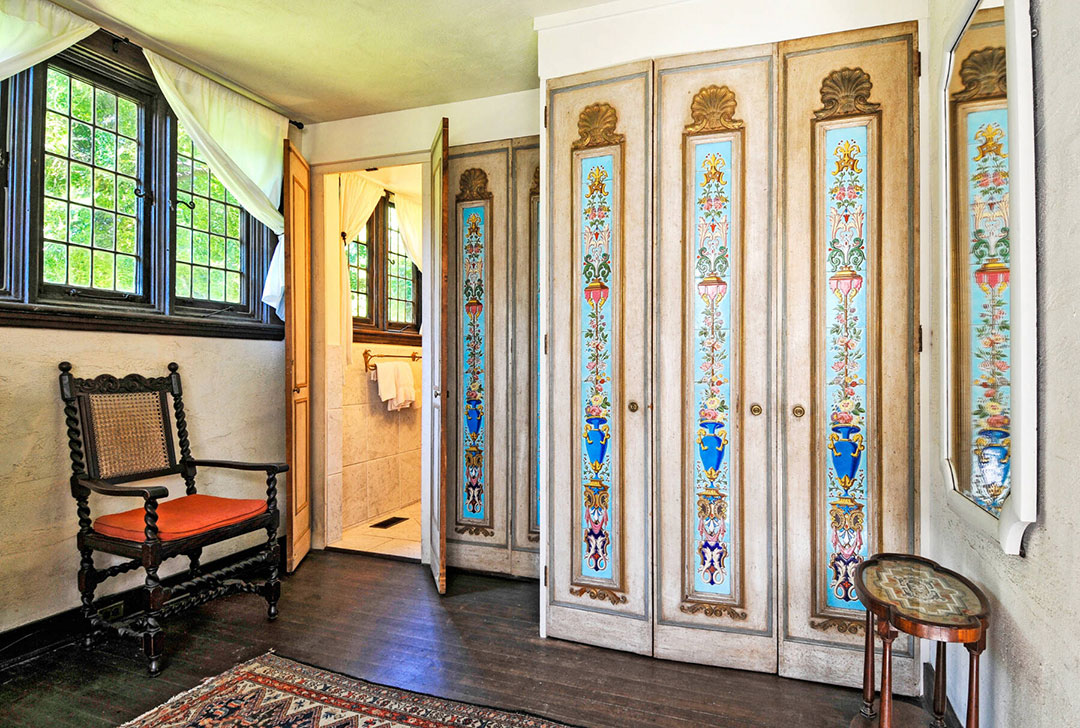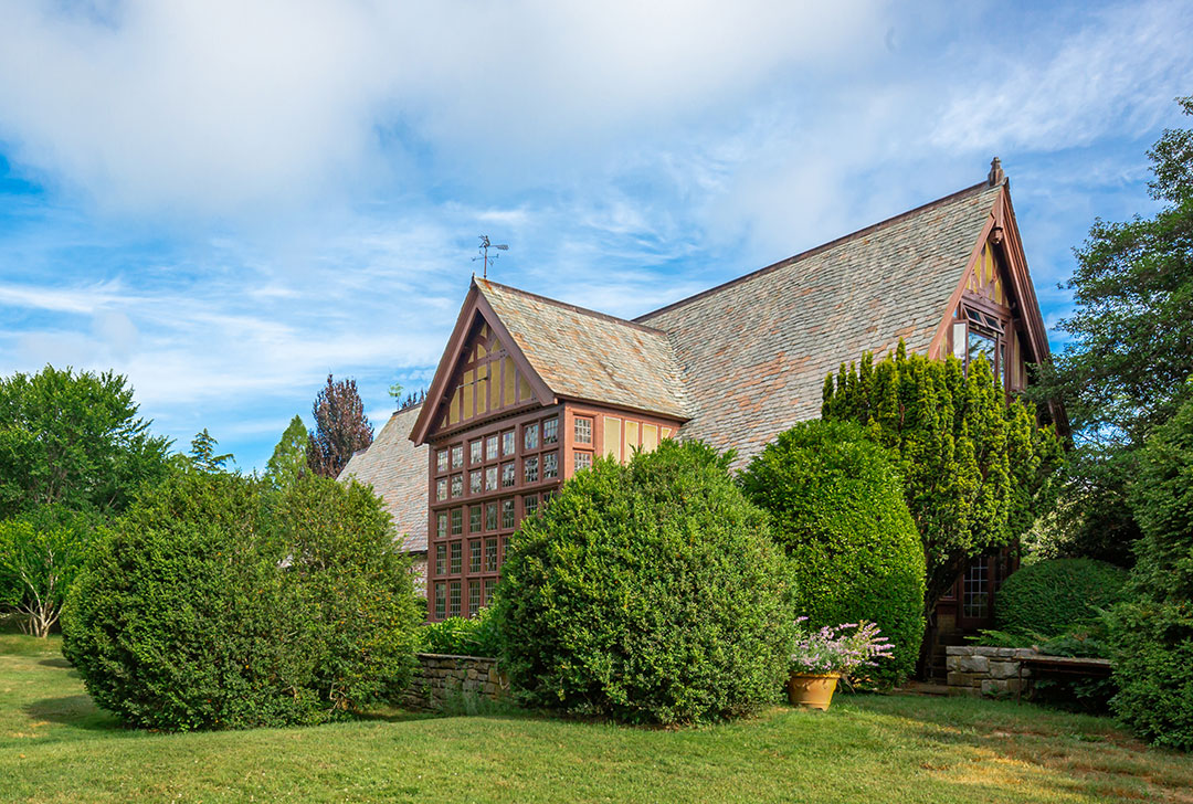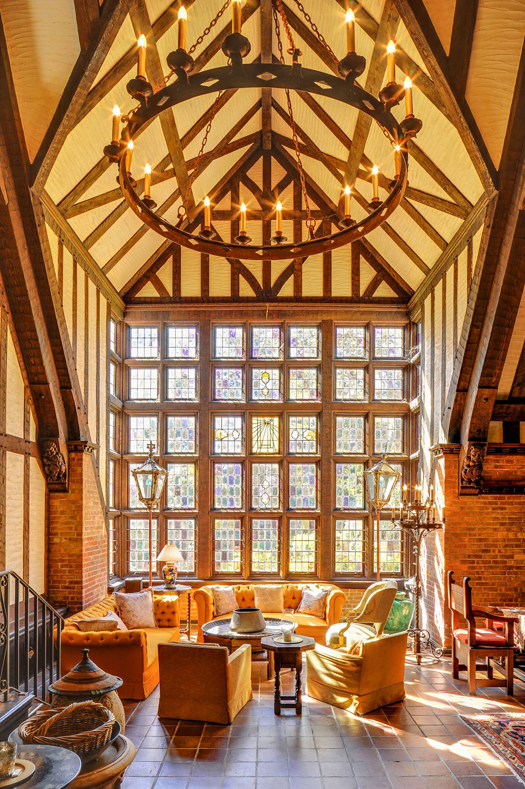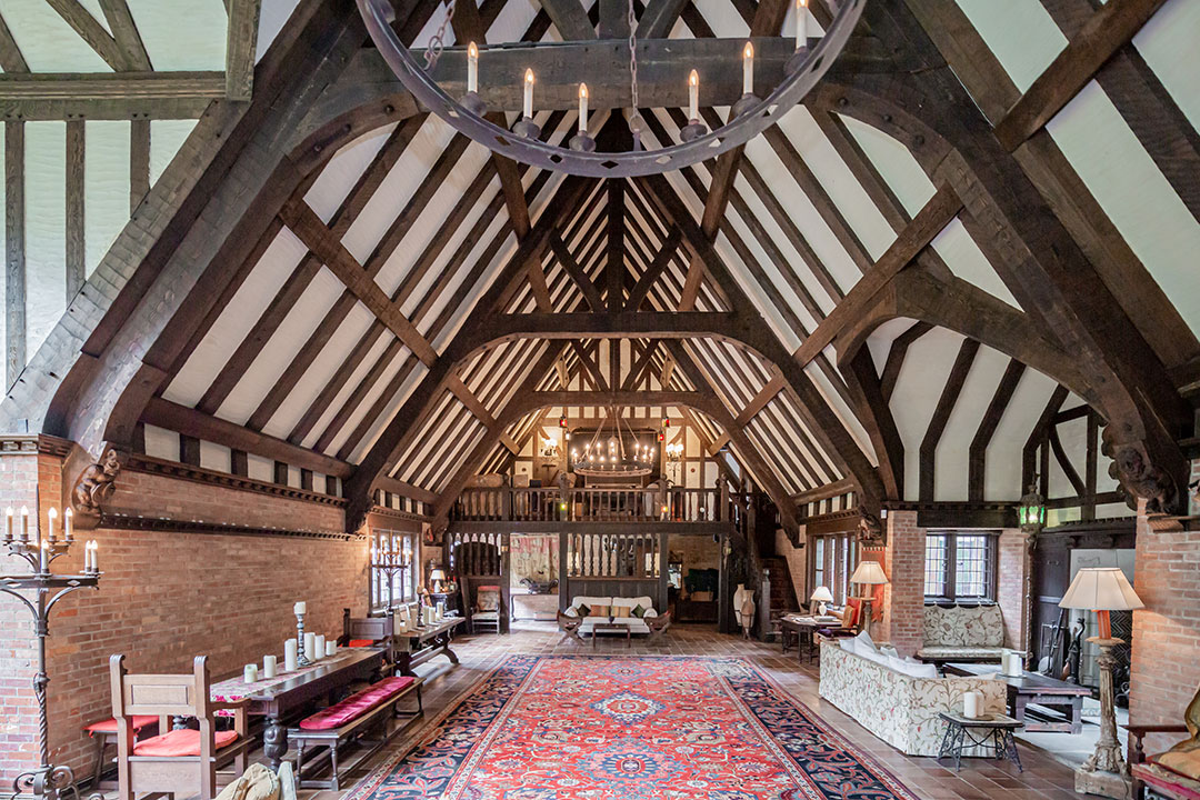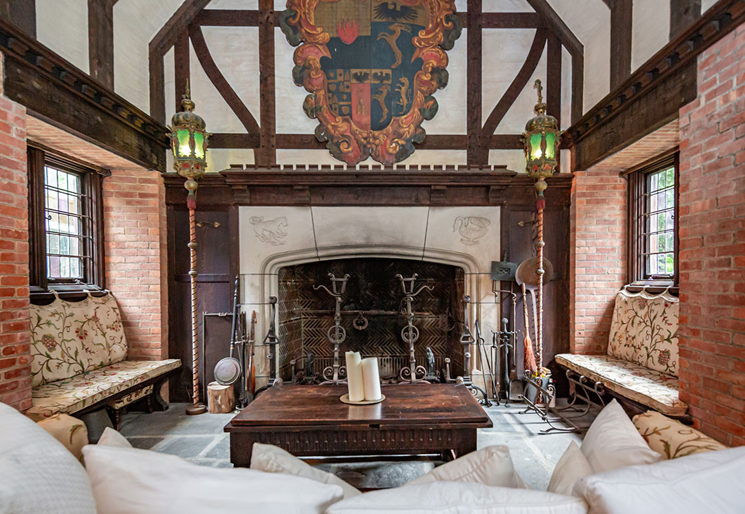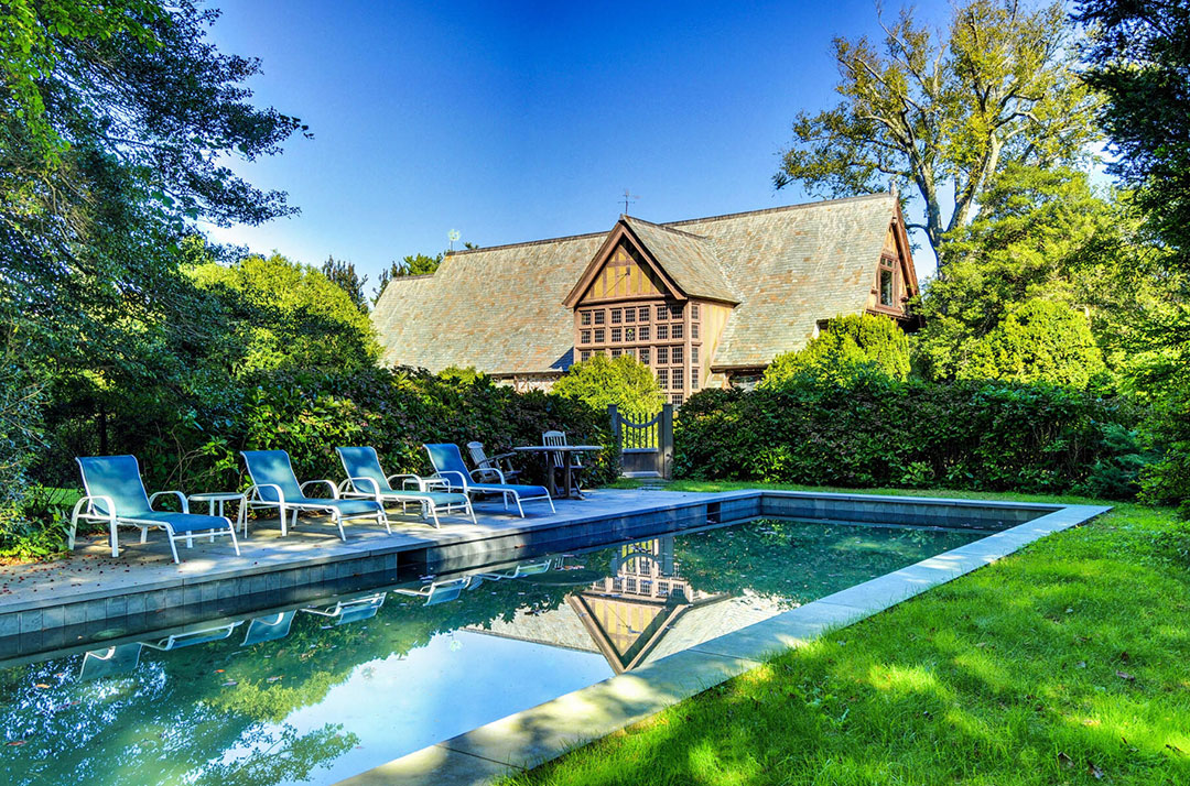 The exquisite three-acre grounds include a gunite swimming pool, mature landscaping, specimen trees, and a terrace. But what’s inside? The home was long known as “The Playhouse” because its 75-foot long Elizabethan-style salon once had a stage and often hosted performances. In fact, cultural workshops and performances was the property’s primary purpose until recently when it was renovated into a residence for the first time by the sellers, per 27East.