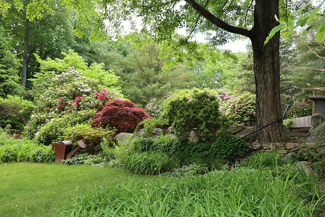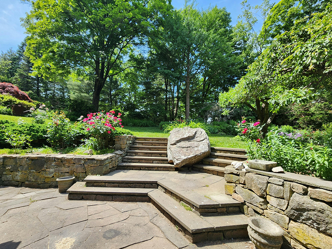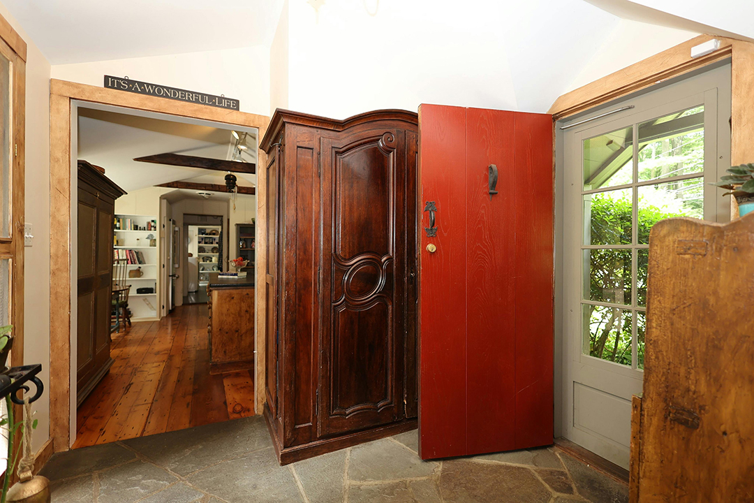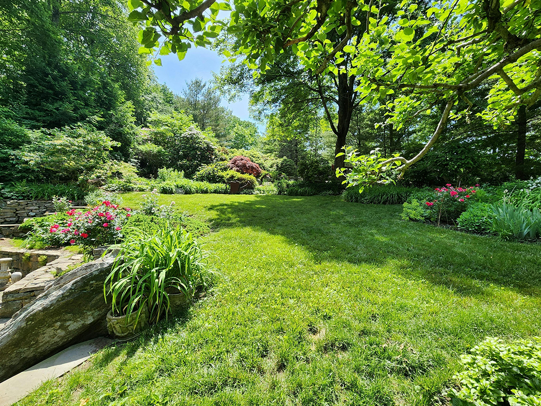 Passing through the French doors, a wisteria-covered patio, secret gardens, a pool all await on the grounds. You’ll also notice gorgeous perennial flowers and other flora surrounding walkways, stone walls, and open lawns across the roughly two-acre property. Mary was an avid gardener.