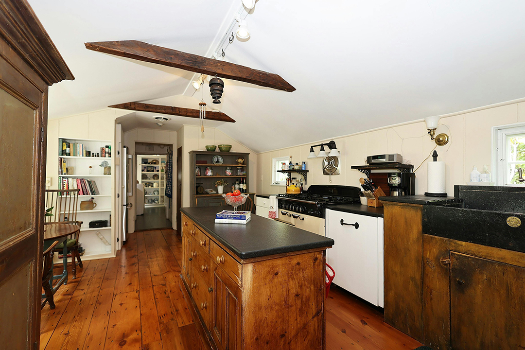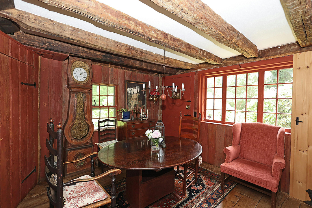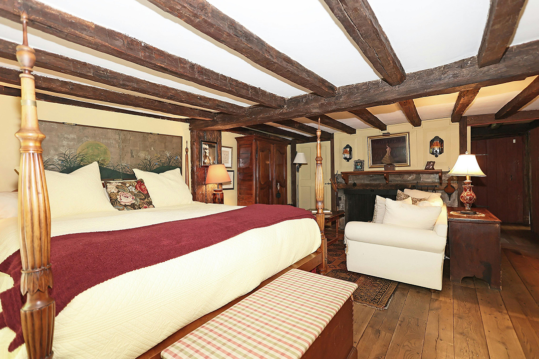 Meanwhile, the four-bedroom main house charms with vaulted and beamed ceilings, a vast amount of natural and painted wood elements, two original fireplaces, and delicate wallpapers. The spirit of the home has clearly remained in tact and been cared for lovingly, making one wonder how many 18th-century period details fill its spaces.