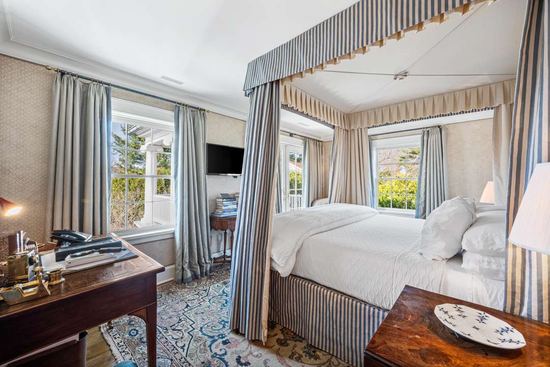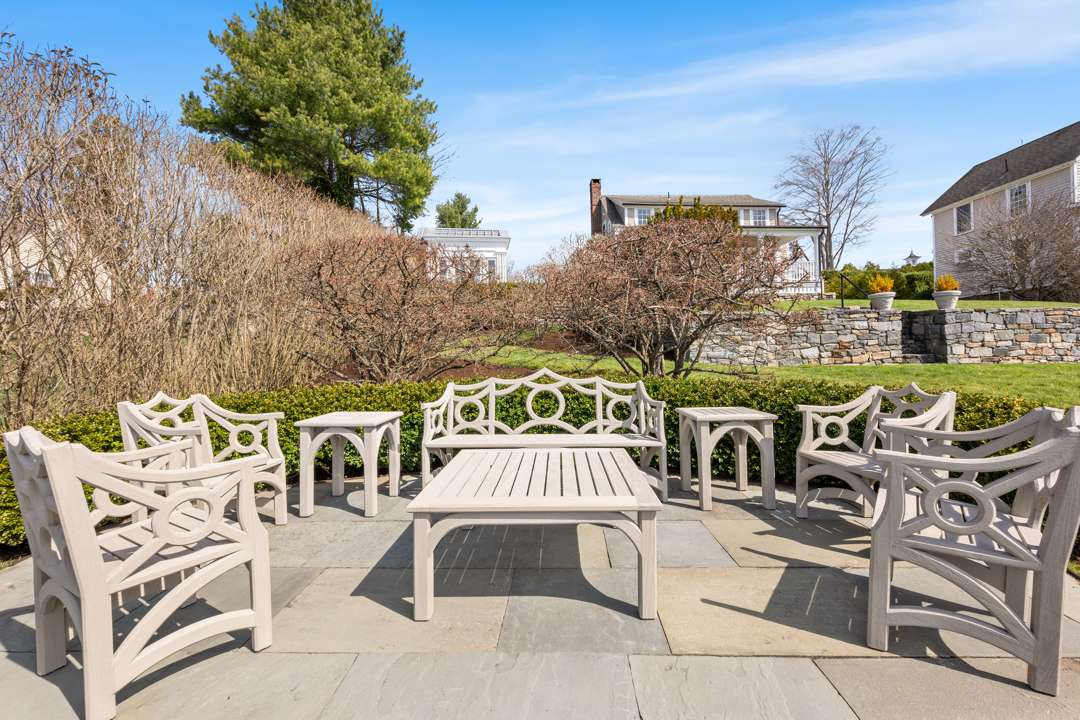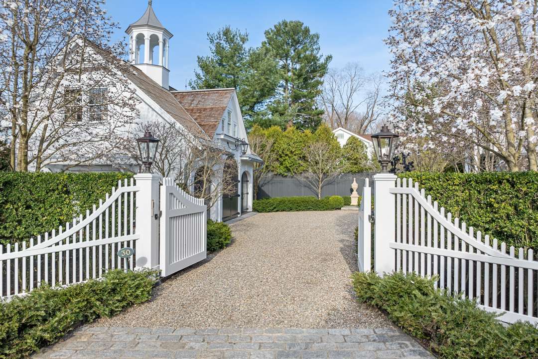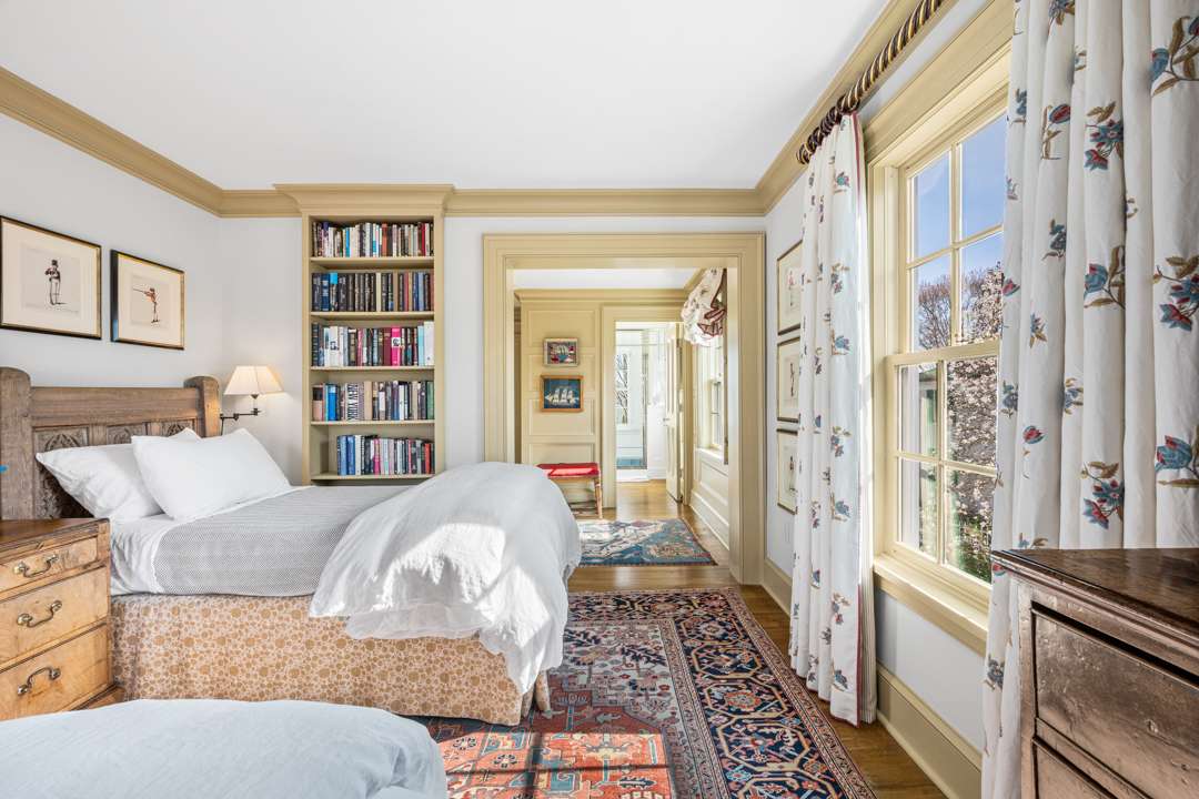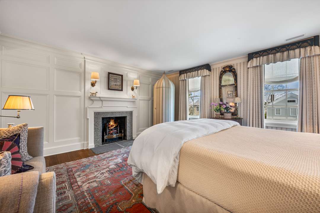 The residence shines with details like a hand-painted mural in the dining room, a brownstone fireplace, kitchen with top-of-the-line appliances, and a 1,100-bottle wine cellar in the basement. Upstairs, which is accessible via staircase or elevator, are three ensuite bedrooms. The quarter-of-an-acre grounds were thoughtfully brought to life by Carol Orr, who designed a series of outdoor rooms: A secret garden, rose garden, auto court garden, urn garden, loft garden. There is an additional bedroom suite above the garage and a “summer house” overlooking the river.