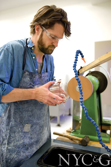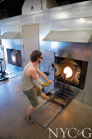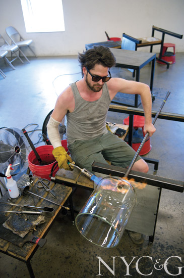 Nestled on the third floor of the hulking UrbanGlass building in Fort Greene, Brooklyn, is a row of fiery furnaces where crucibles bubble with liquid glass. Craftsman Andrew Hughes, his clothes worn and his arms covered in old gym socks to protect him from the scorching heat, holds a long, hollow steel blowpipe, dips the tool into the molten liquid, and begins his workday. “Glass is a rewarding material,” he says. “But it’s also incredibly frustrating. You need an intimate relationship with it in order not to just walk away.”