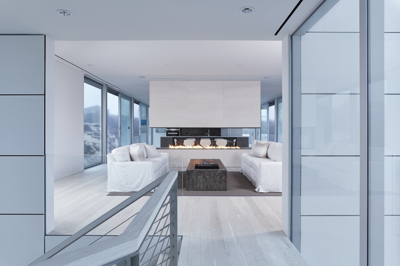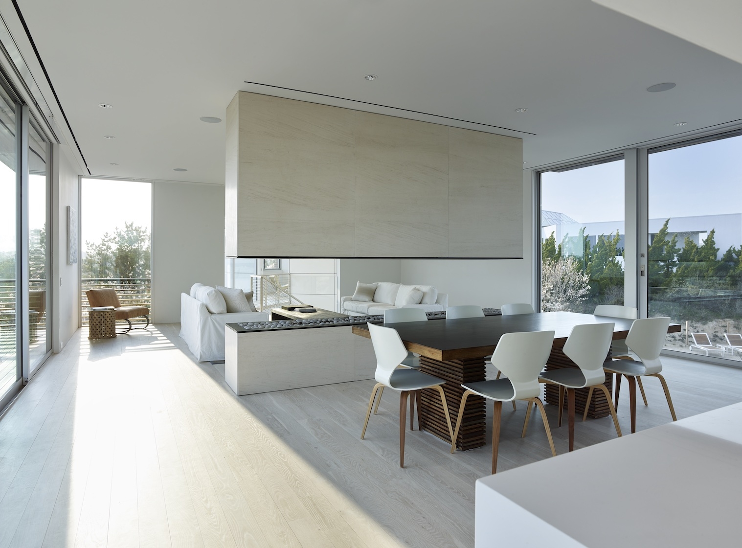 Glass walls flood the dining room with natural light.