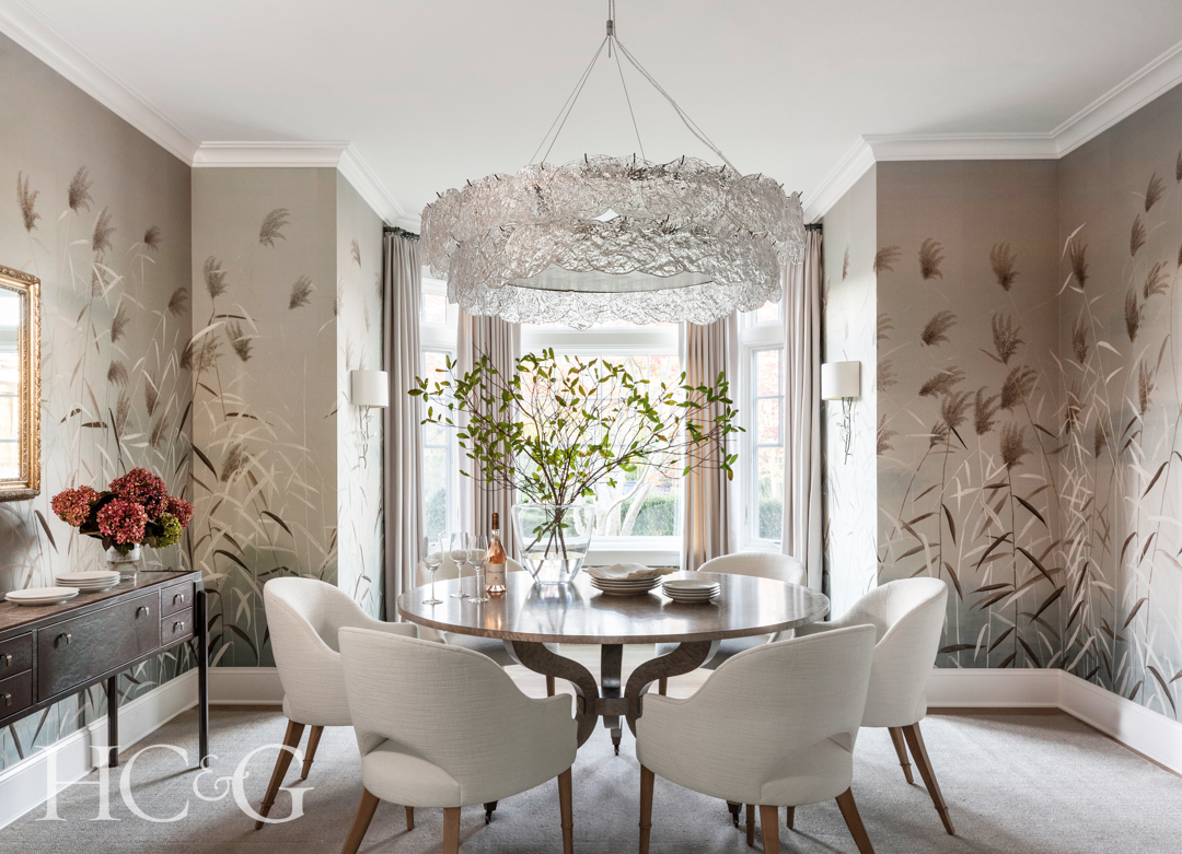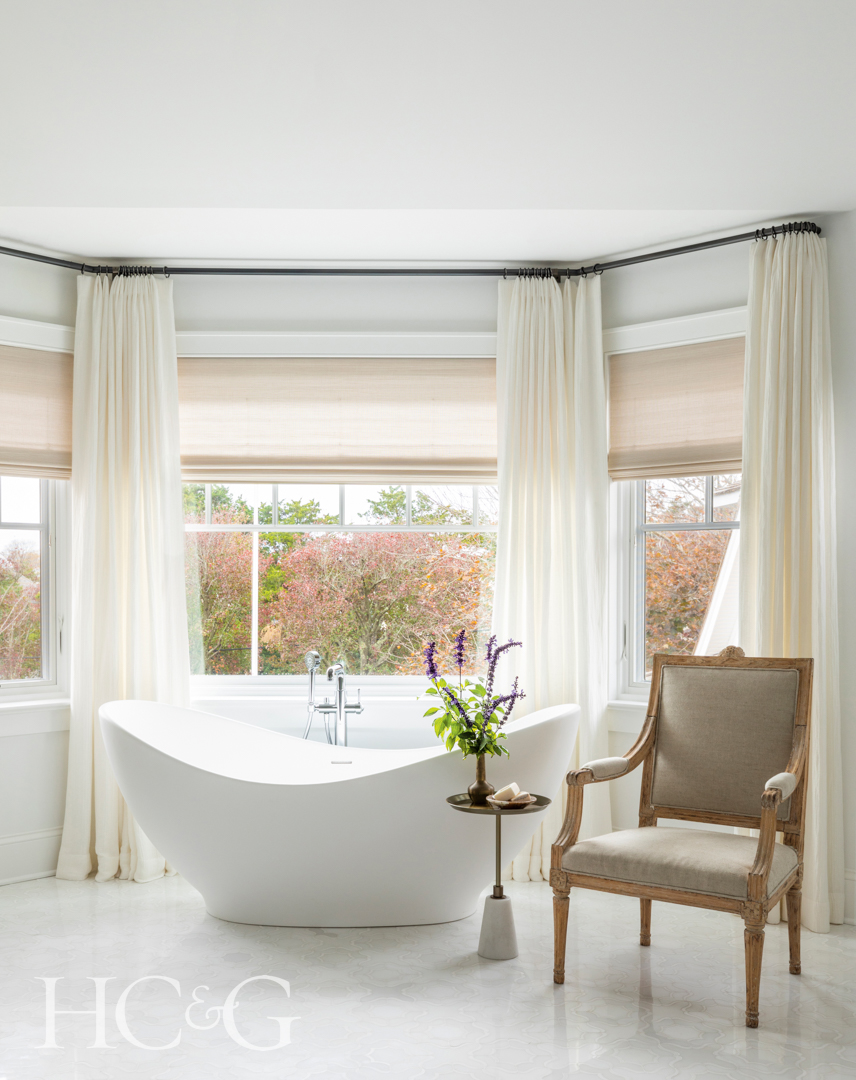 “There is a lot of contrast between bright, open spaces and those that are dark and cozy,” continues Hamel. “For the palette, we were influenced by the sea and sand as the clients wanted it to feel like a beach house. We selected neutrals, soft grays, and blues. The wife specifically requested a white primary suite, so we brought in textured fabrics and items with an organic quality to help bring dimension to the room.” In the same vein, there’s also a soft, restrained powder room featuring an MJ Atelier wall covering with subtle white plaster appliqué. “The clients wanted a beautiful, calm retreat,” says Marie Flanigan. “My favorite thing about the residence is its interesting architectural angles. There are porches and quiet moments outside that allow for different vistas, making the rooms feel intimate and cozy. This house is full of character and charm.”