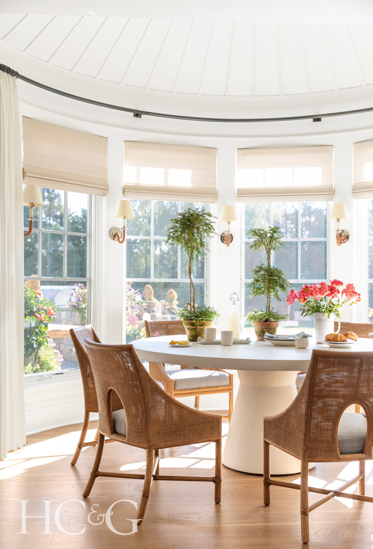 The family of six was coming from a smaller beach house nearby, so the most pressing directive for this project was enough seating for large family gatherings of 20 to 25 people. “The clients love cooking, hosting, and just being at home with their family,” says Hamel. “They like spending time by the pool, having big dinners outside on the patio, and comfortable sofas to sink into to watch television together. The house is spacious, but everyone gathers in the kitchen and family room.” Luckily, there are plenty of spots for hunkering down in and around the kitchen, which features both bar seating and a breakfast nook. Open to the kitchen is the family room, an airy vaulted space with a floor-to-ceiling stone fireplace. And on the opposite end of the kitchen, a light-blue built-in bar area leads to the great room, where various seating areas can accommodate a myriad of activities at once—whether it’s playing a game at the corner table and banquette, lounging on the sectional, or having a dinner party at the large dining table. Meanwhile, the formal dining room—enveloped in a customized de Gournay wallpaper that recalls the reeds growing in the coves nearby—is actually a more intimate space meant for smaller gatherings. Moreover, several porches offer plenty of opportunities for outdoor meals and activities.