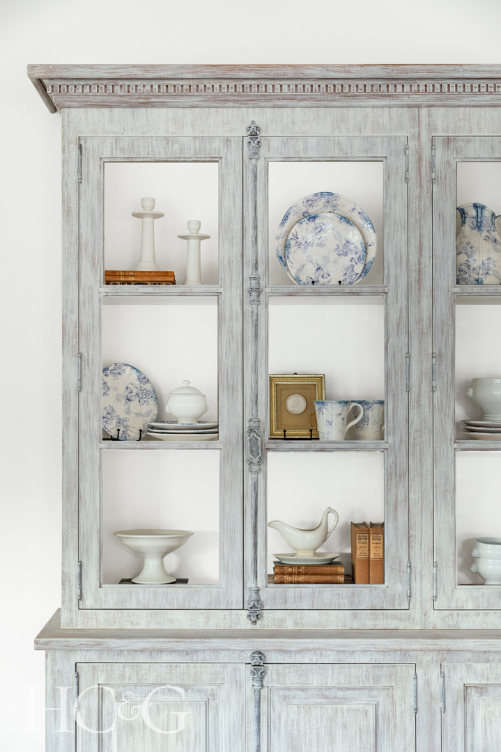 In addition to the main entertaining areas, there are more private spaces to accommodate work and quiet activities. The husband’s office, for example, is a serene, inviting room with blue millwork and a wood ceiling that’s complete with its own sitting area and bath. “The office is off the great room, so he can be near the family and then shut the door when he requires privacy,” says Hamel. In the hallway near the office, a curved turquoise banquette was crafted to fit perfectly into a window nook and serves as another spot to relax, read, or play a game.