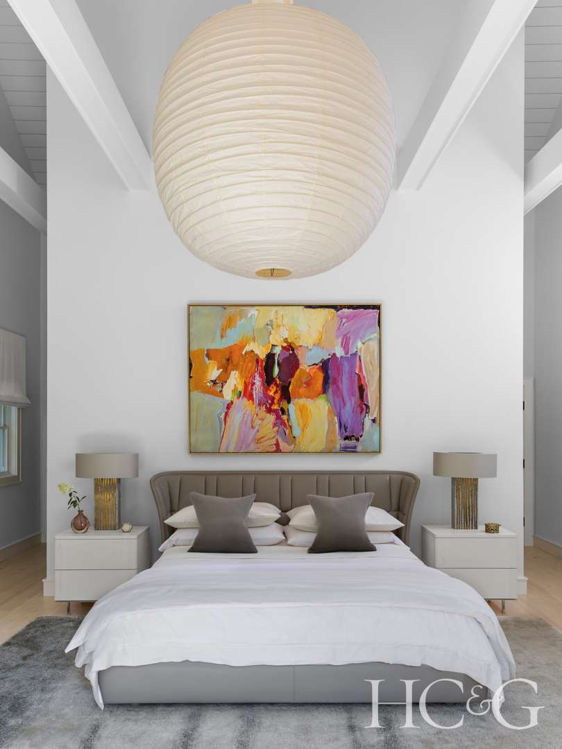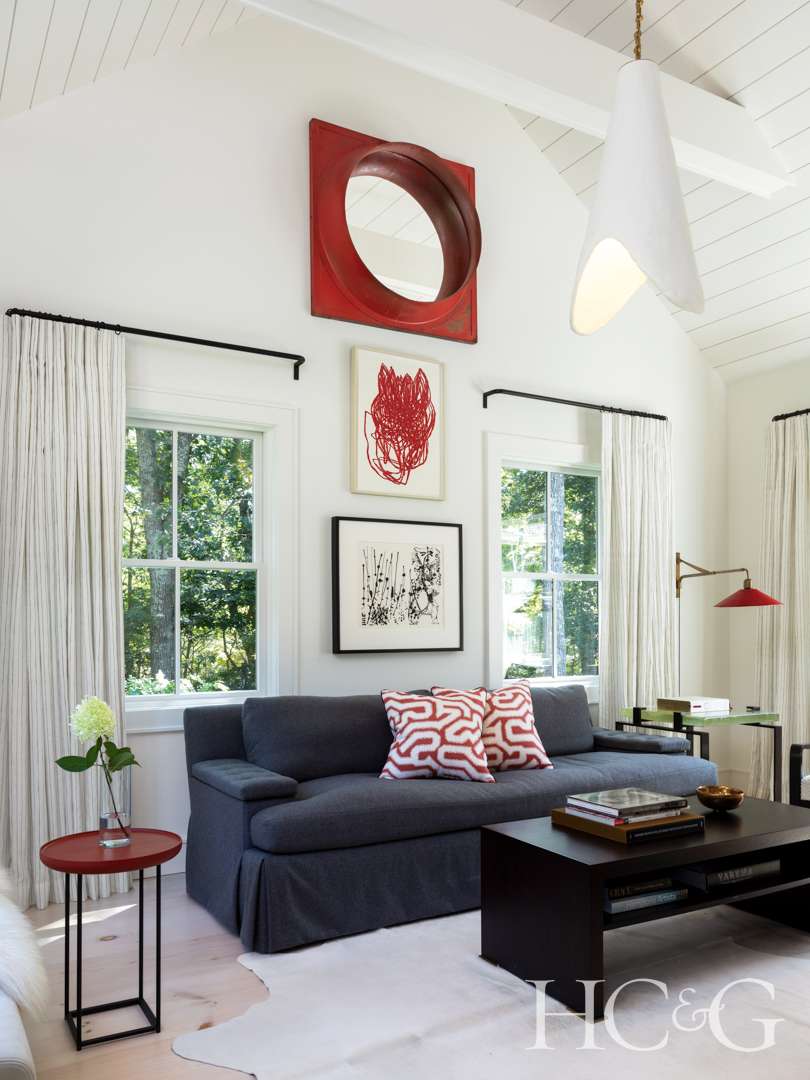Not surprisingly, furnishing the home became its own challenge—cherry-picking and salvaging items from her other residences, which included an apartment in The Mark Hotel on NYC’s Upper East Side (one that she shared with her late husband) and a house in Birmingham, Michigan (the lovely Detroit suburb where Knollenberg has his main office). While Knollenberg, who also also has an office in Manhattan, kept to his preferred neutral backdrop, employing Benjamin Moore’s White Dover throughout, he was careful and strategic in his placement of colors, forms, and textures. A cabinet covered in a red leather animates the bright foyer, while the stairway wall is hung with a string of gold-leafed butterflies that appear to be aflutter when hit with the slightest of breezes. He put an inviting daybed at the end of one side of the long living room, and he hung mercury-glass elements in a guest bedroom that take on the effect of giant water droplets. He chose the biggest Noguchi paper lamp he could find to hang over the bed in the primary suite. “A room with a vaulted ceiling like that needs a dramatic fixture,” he says. “And it felt a little BoHo, in keeping with Sarah’s personality.”