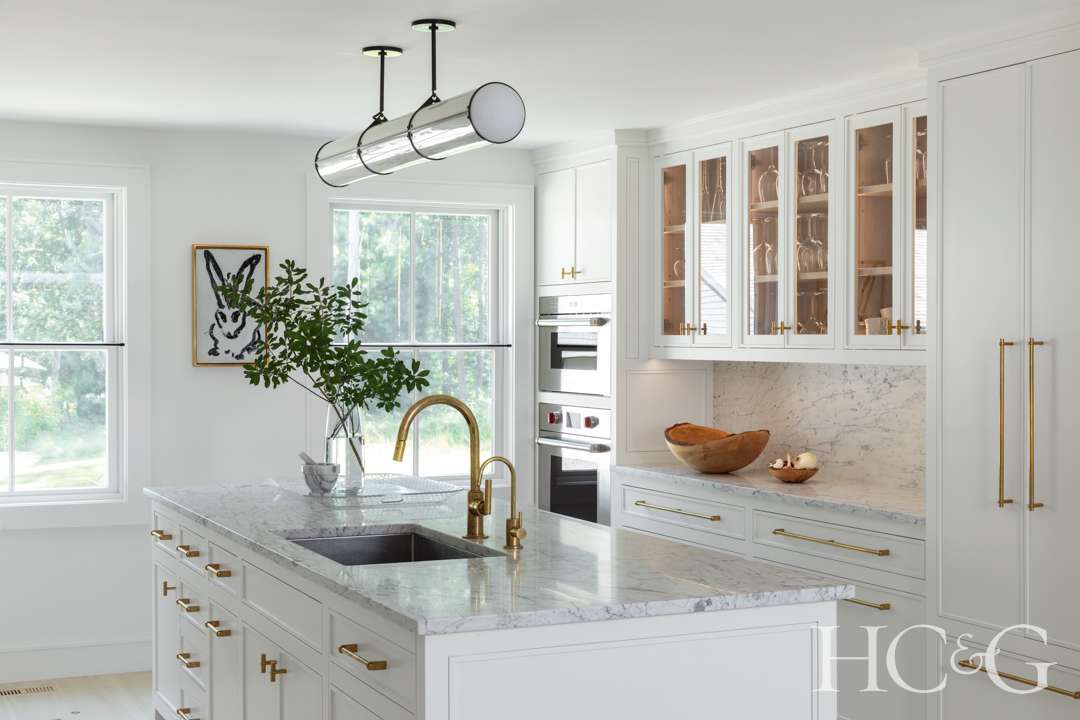 True to its period style, the interiors, however, were, perhaps, too period-perfect. Knollenberg describes the original rooms as a “bit kitschy,” adding that the former owners had gone to great pains to make it a letter-perfect Colonial, with old-time mantels and door hinges out of ye-olde taverns.” A total gutting and reconfiguring transformed the home into something still Colonialesque on the outside, but fresh, bright, and modern on the inside. Knollenberg’s floorplan changes included flipping the main staircase from the front of the house to the rear, moving the kitchen forward, and tearing down a small barn to replace it with a vaulted den and spacious first-floor primary suite.