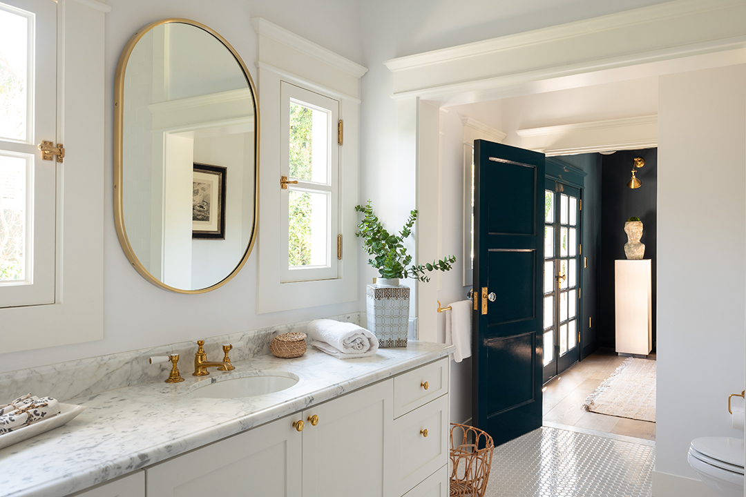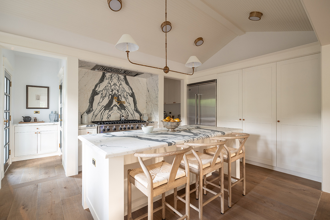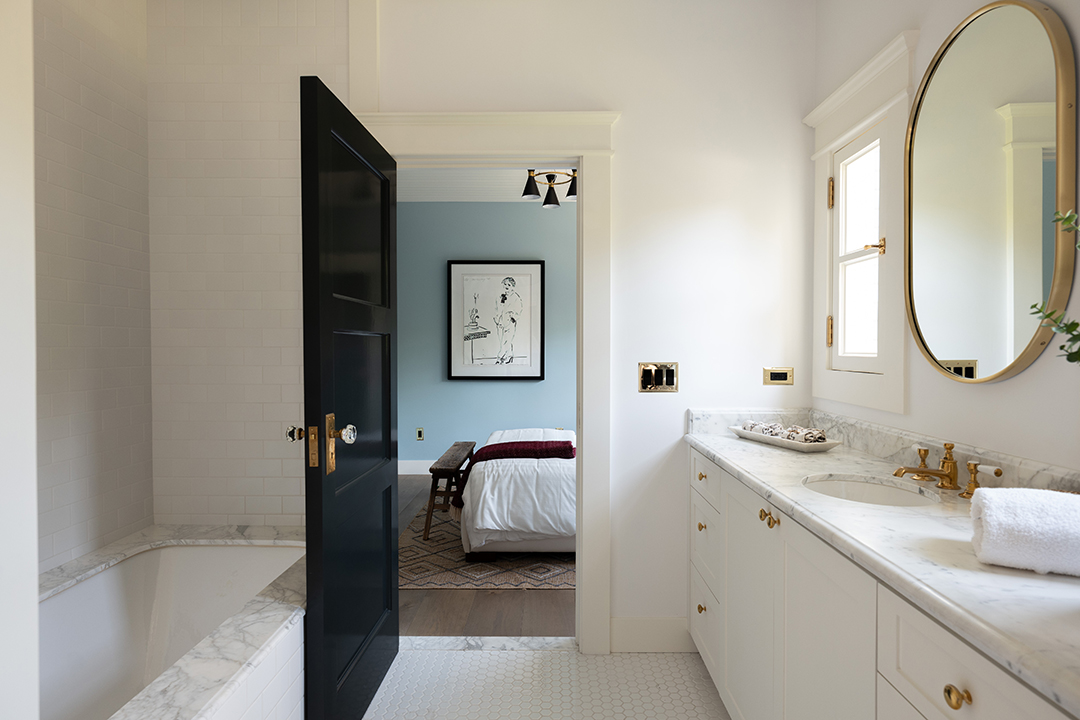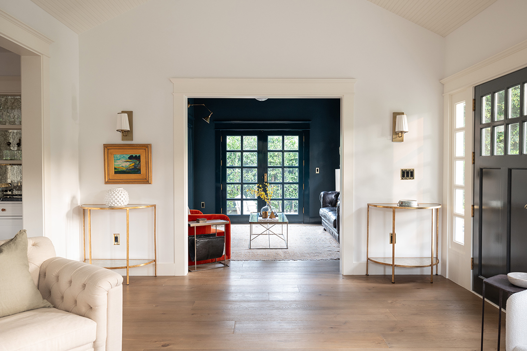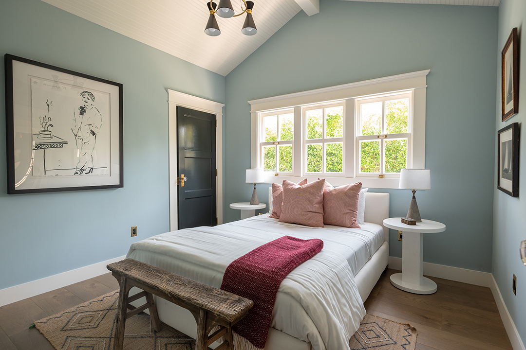 Walking into the four-bedroom main house, a glossy blue wood-paneled living room greets you one one side while an white, neutral-dominated living room awaits on the other side. This gives you immediate mirroring entertaining spaces to suit whichever mood you’re in: Powerful and edgy or relaxed and peaceful. The chef’s kitchen is arguably even more show-stopping. It wows with honed Statuario Arabescato stone countertops, custom fixtures and hardware, a simple yet impactful light fixture, and top-of-the-line appliances.