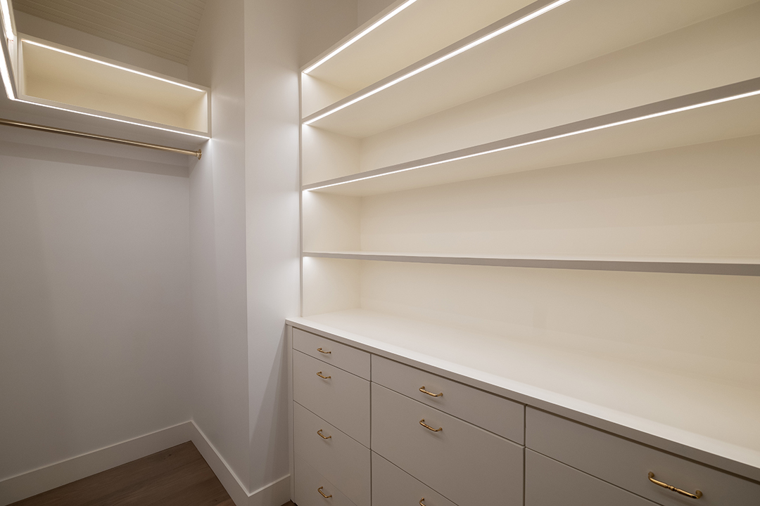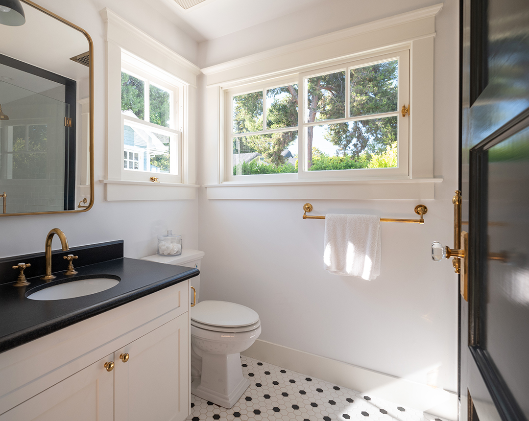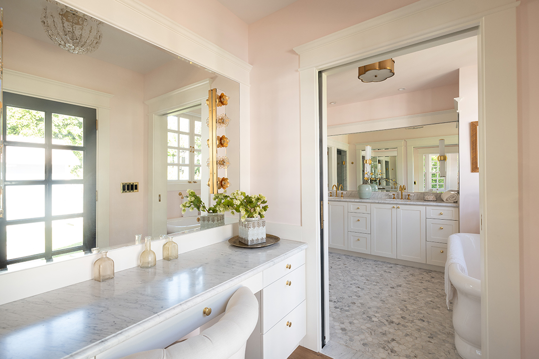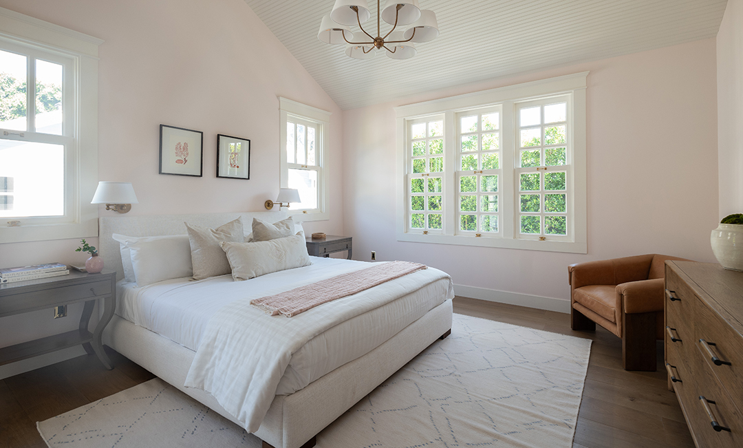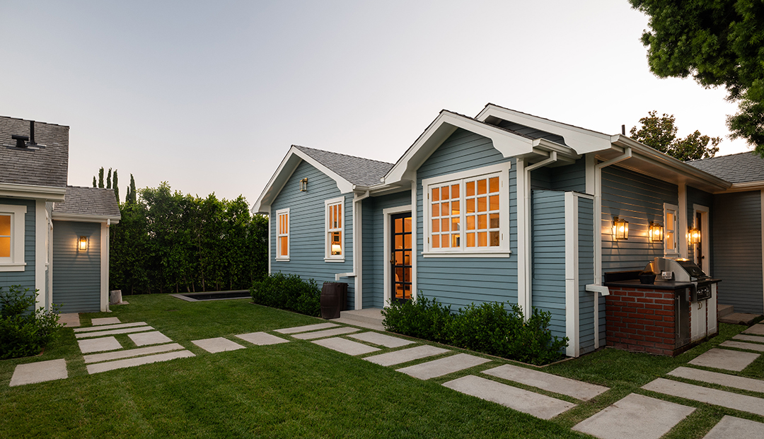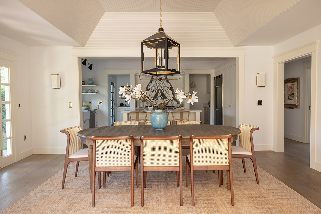 Walking into the four-bedroom main house, a glossy blue wood-paneled living room greets you one one side while an white, neutral-dominated living room awaits on the other side. This gives you immediate mirroring entertaining spaces to suit whichever mood you’re in: Powerful and edgy or relaxed and peaceful. The chef’s kitchen is arguably even more show-stopping. It wows with honed Statuario Arabescato stone countertops, custom fixtures and hardware, a simple yet impactful light fixture, and top-of-the-line appliances.