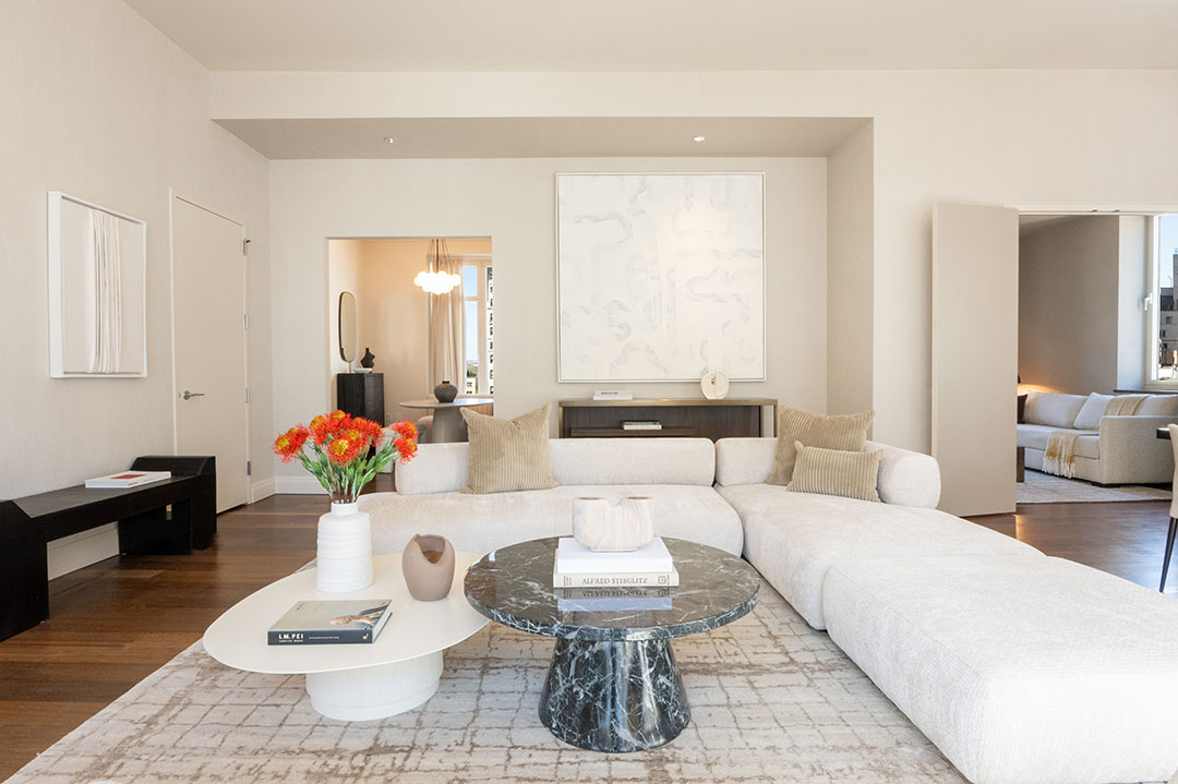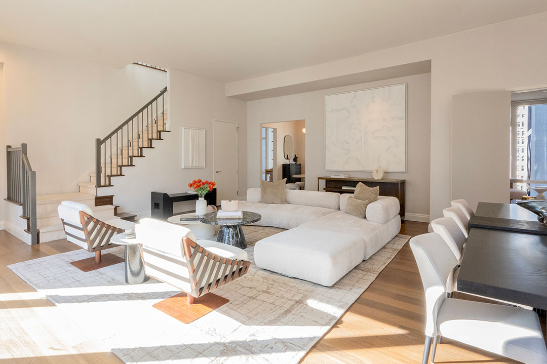 The building, completed in 2010, boasts a French limestone facade and large windows—but the listing’s allure doesn’t stop at the front door of the building. The residence is just as enticing inside, as it is outside. Interior Marketing Group completely reimagined Penthouse B to showcase the duplex’s design possibilities. And, while the furnishings are for staging purposes, they are available to purchase for buyers looking for a seamless, turnkey, and stylish move-in.