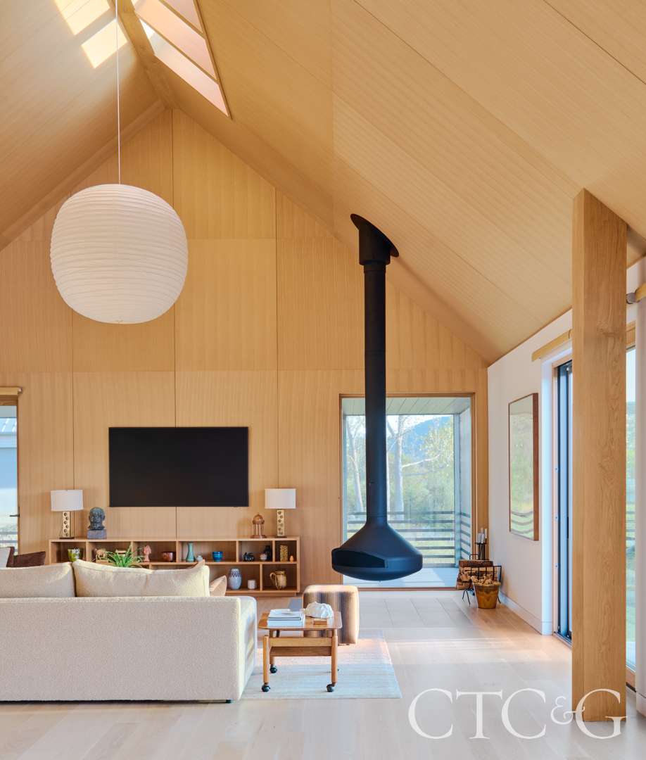 The expansive, volumetric living room, which melds with an eating area and the kitchen, is furnished with a sectional and a fireplace that hovers mid-air. “What works about that fireplace,” he says, “is that it makes the space intimate. When you’re on the sofa, you’re eye level with the flames.”