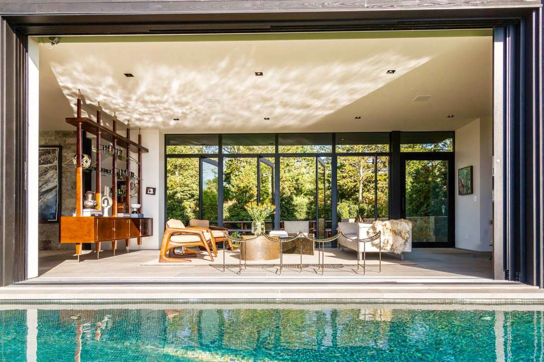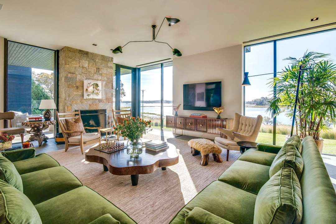 When it comes to the overall vibe, it is the epitome of sleek Hamptons living and cool design. Wood, stone, and glass details await at every turn. Pivot doors line the front of the home, while retractable glass walls span the rear of the home. So, indoor/outdoor living and entertaining is a breeze since you can swing all the glass open and merge with the al fresco living areas. Meanwhile, the styling done by Robert Rufino add warm hints of boho, eclectic flair that reflect the artistic facets of the Hamptons as well.