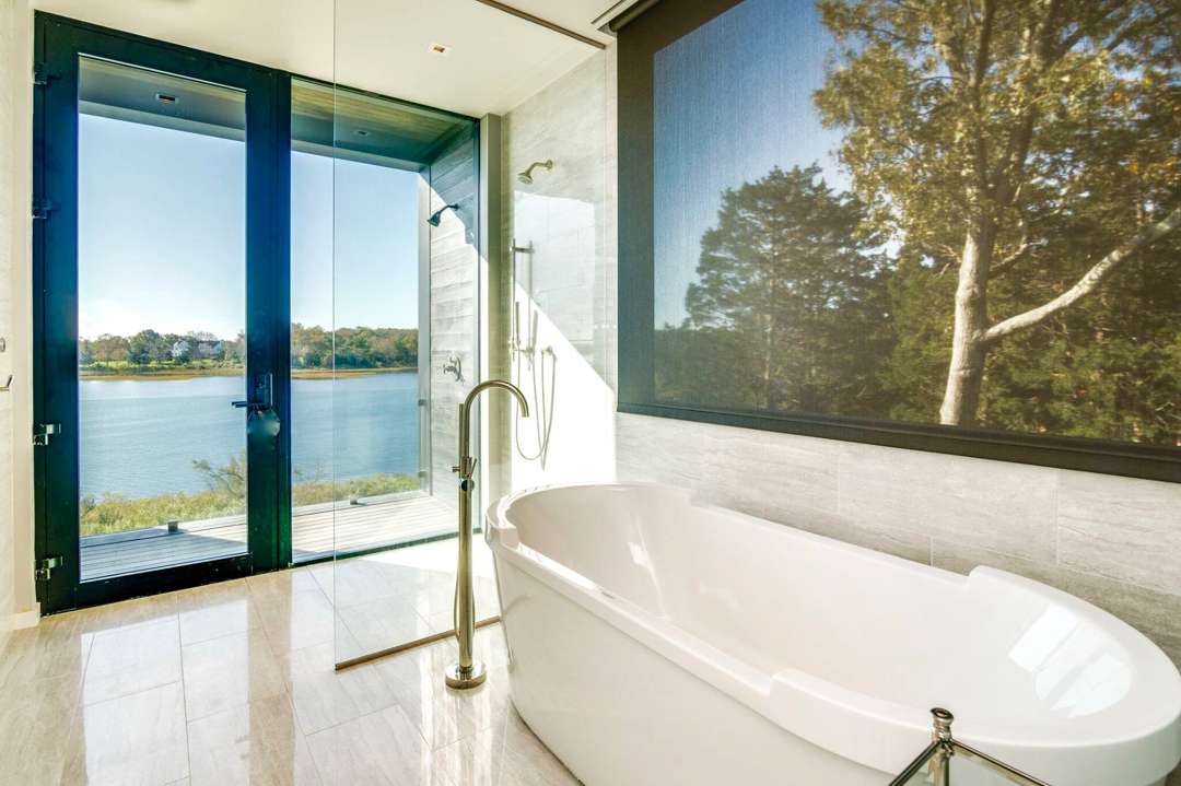 Hamptons-based Blaze Makoid Architecture designed the modern marvel, which was completed in 2017. The striking residence sits on over an acre of waterfront land and spans 6,300 square feet. A great size for sharing with friends for the month, the home also offers five ensuite bedrooms—two of which are primary bedroom suites.