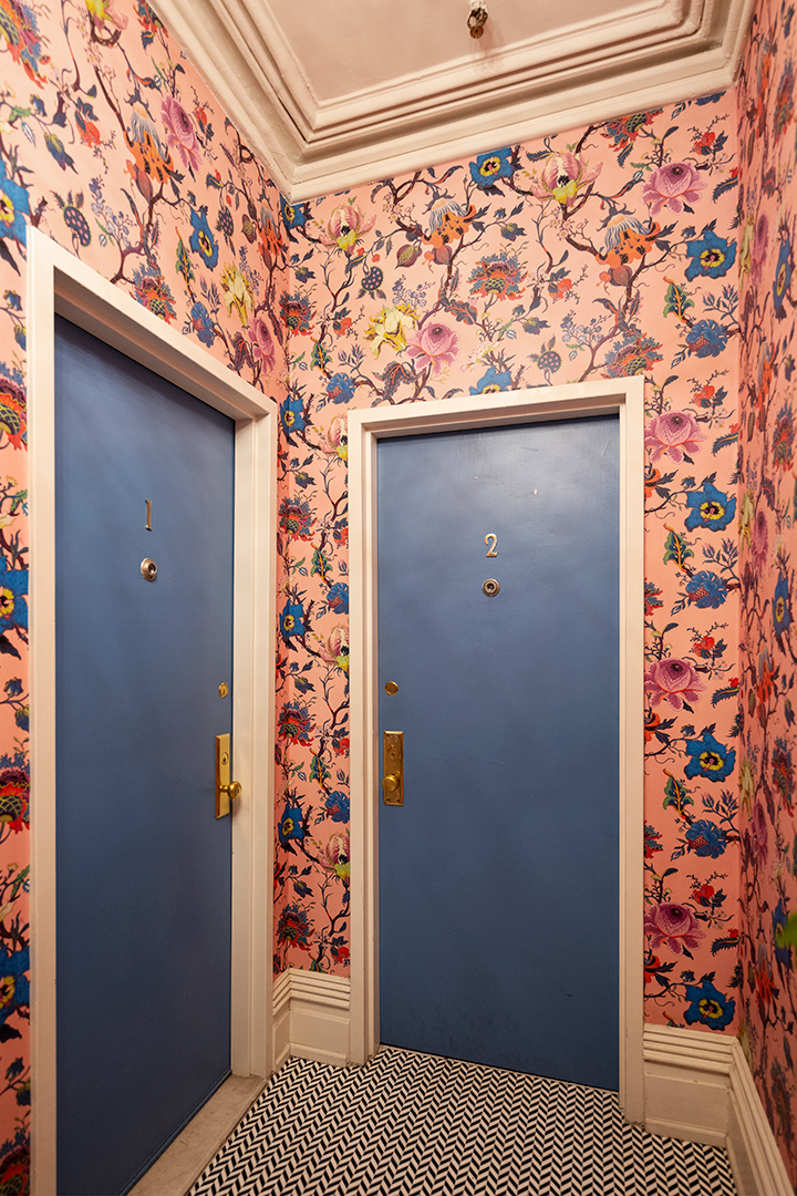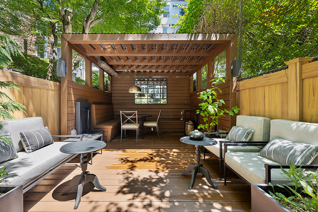 Unit #1 is a two-bedroom duplex with a garden level entrance. It has large windows and soaring high ceilings in the main living room, creating a relaxing, airy feel. Colorful walls and wallpaper set this residence apart from the typical clean, and more sterile, new apartments being built today. A standout feature is the gorgeous loft, which is currently used as a bedroom. Outside, there’s a generous backyard with a covered dining area, perfect for hosting guests and enjoying Manhattan’s seasons right at home.