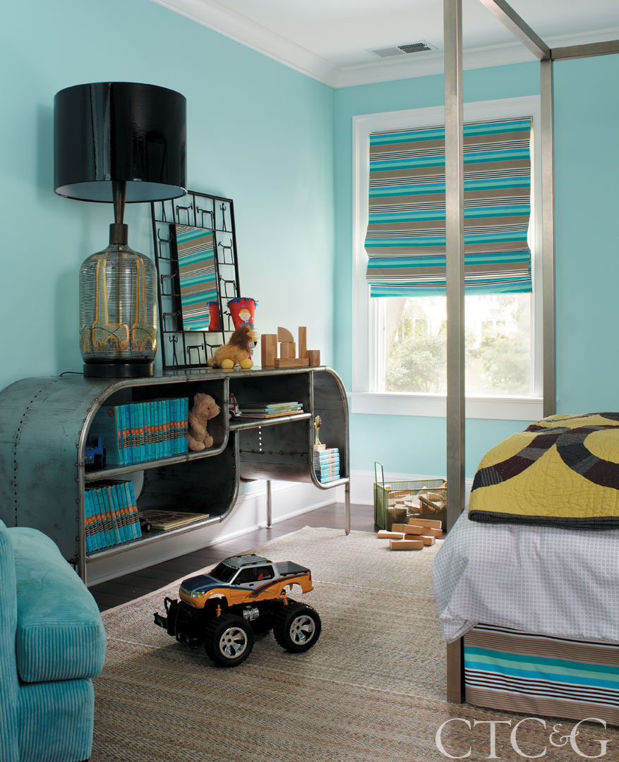 In a boy’s bedroom, a mid-century painted glass “llama” lamp sits on the polished repurposed steel panel and tubular steel console, both from Avant Garden.