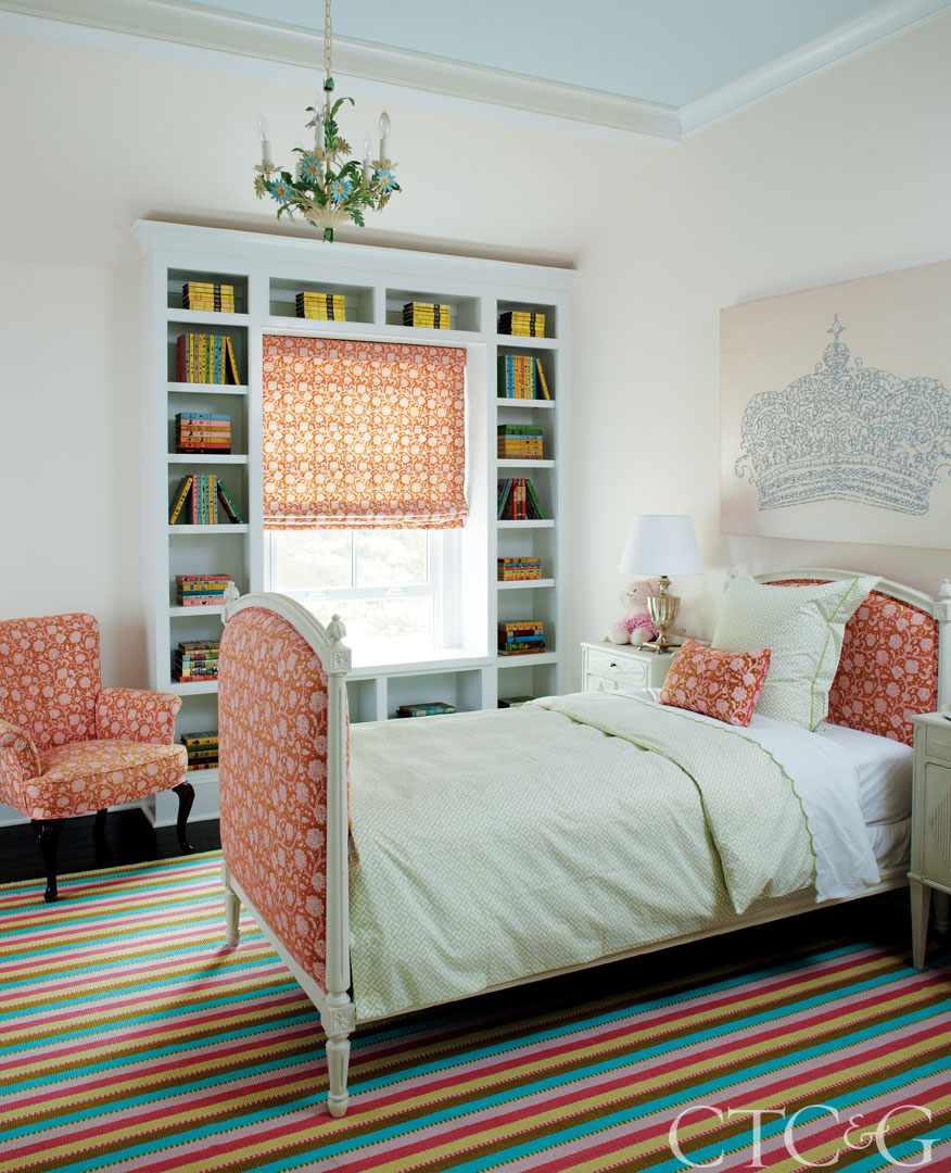 In a girl’s bedroom, the Gustavian bed is from Country Swedish; window shades and club chair are upholstered in John Robshaw’sJohn Robshaw’s Mathura Kashmir print. Vintage painted chandelier is from New Canaan’s Odesmith & Richards.