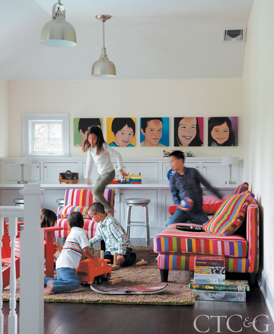 The five Lau children jump for joy in their color-saturated playroom. Sitting atop a Stark rug, the Crate & Barrel sofa and chair are upholstered in Donghia’s Hamaca Rojo fabric. Caroline Harris, the daughter of the home’s architect, painted the children’s portraits.