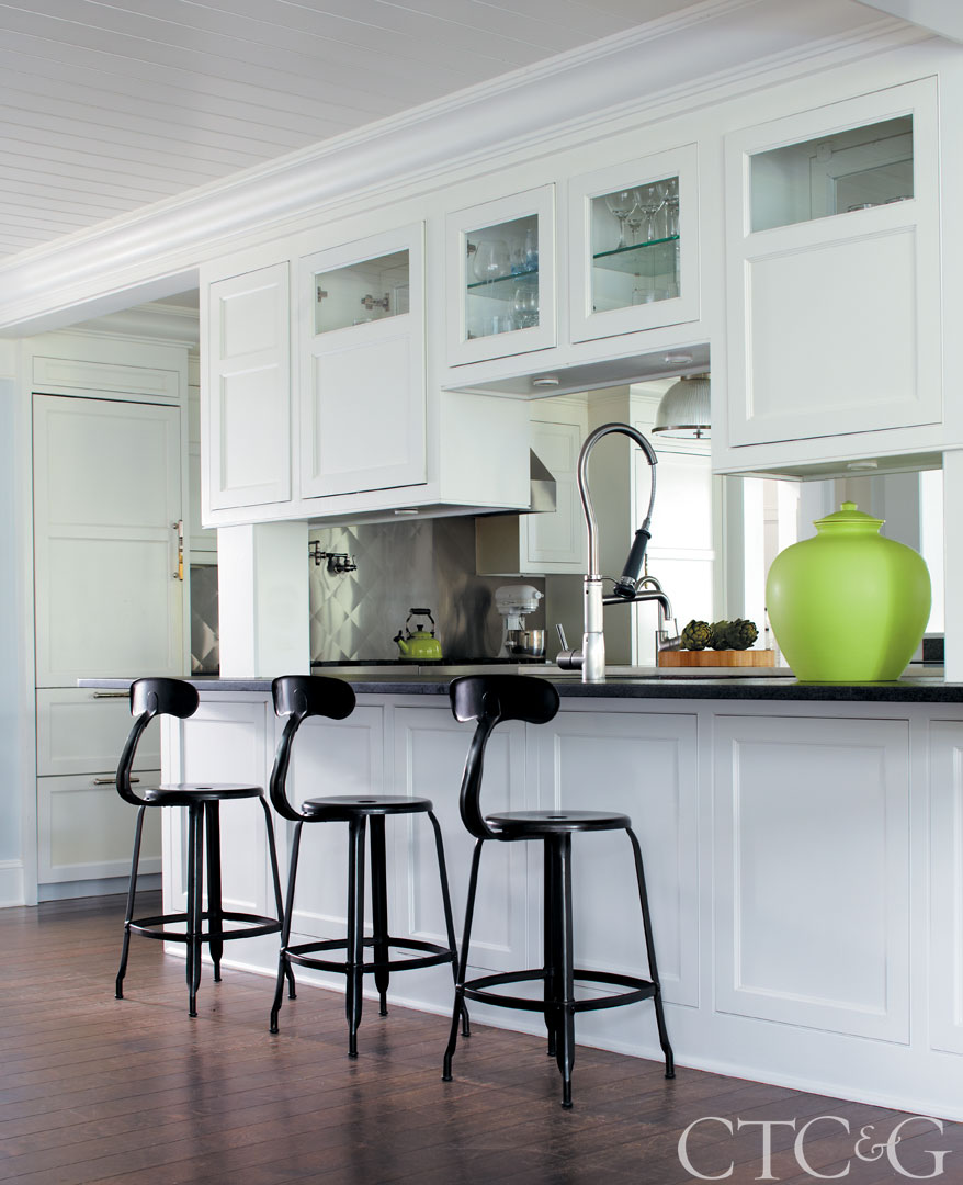 The kitchen’s French steel stools, from Avant Garden in Pound Ridge, are based on moulds from the 1930s.