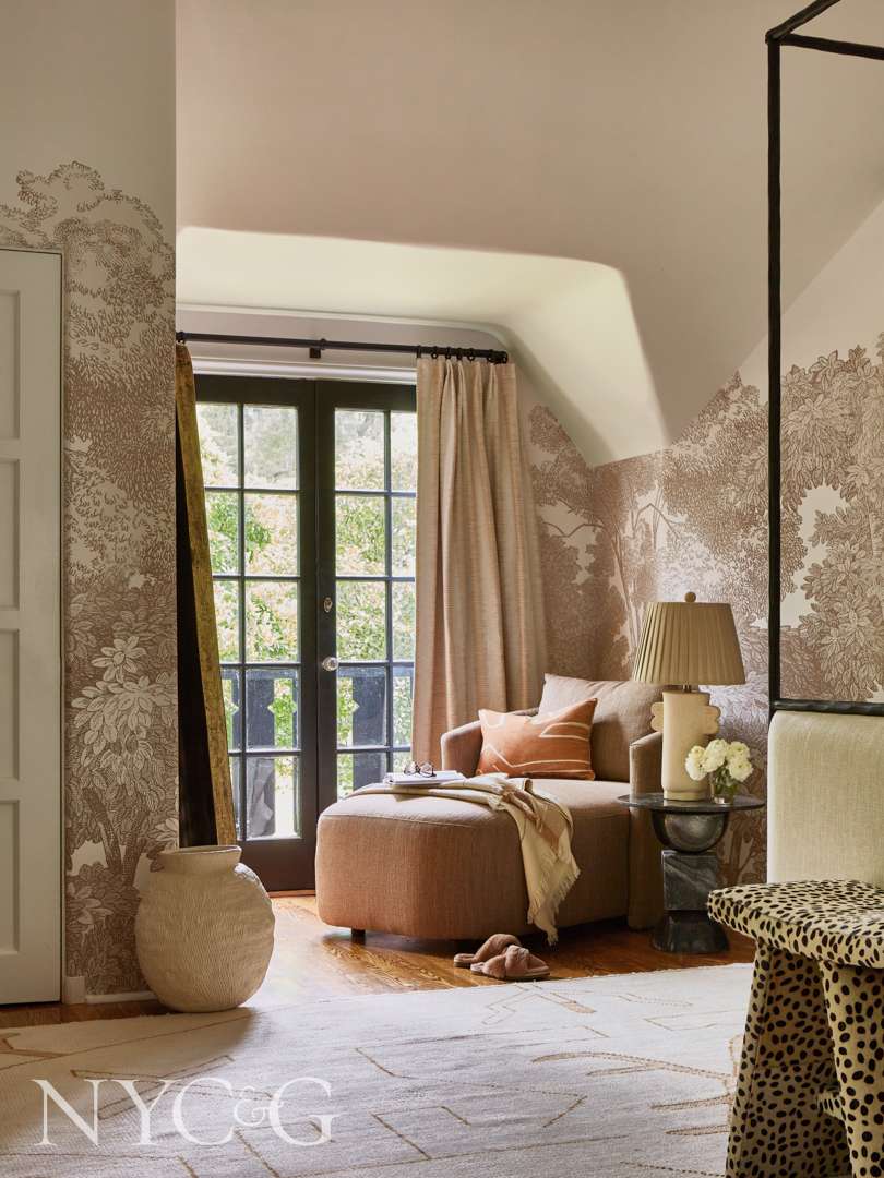 Coren chose a dusky rose-hued chinoiserie wallpaper for the dining room, and a big-scaled pattern of sepia-toned trees in the master bedroom, “a motif that bridges the gap between feminine and masculine,” she stresses. A corner seating area provides yet another experience. “I didn’t want a spot which would wind up filling with tossed clothes, but one where I could read and where my children could come in the evening and read with me.”