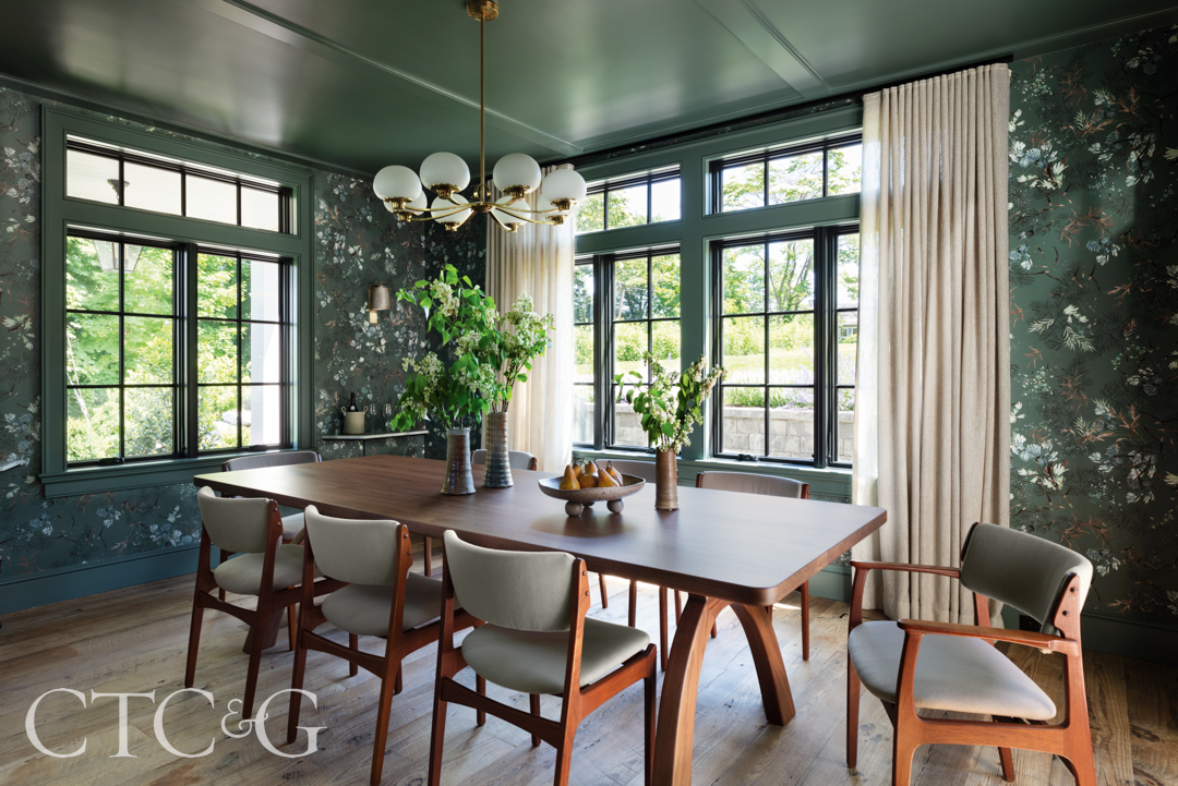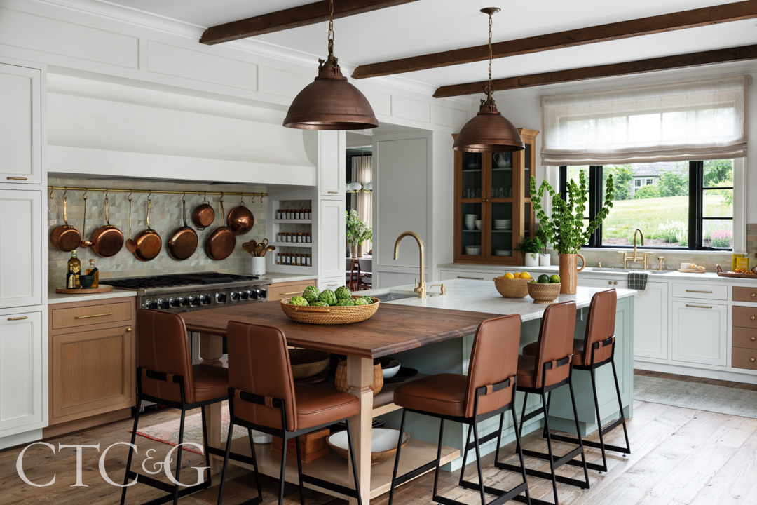 Meanwhile, the arrestingly large, yet still intimately scaled, 600-square-foot kitchen, is defined also by an island whose surface is composed of a handsome walnut and off-white quartzite. “Amanda is an expert cook, she has an incredible collection of copper pots that she wanted to display, and she definitely didn’t want a typical all-white kitchen,” explains Slutzky. As a result, she and Jones designed a novel island that the homeowner says with pride, “looks like a real piece of furniture—it even has turned wooden legs.”