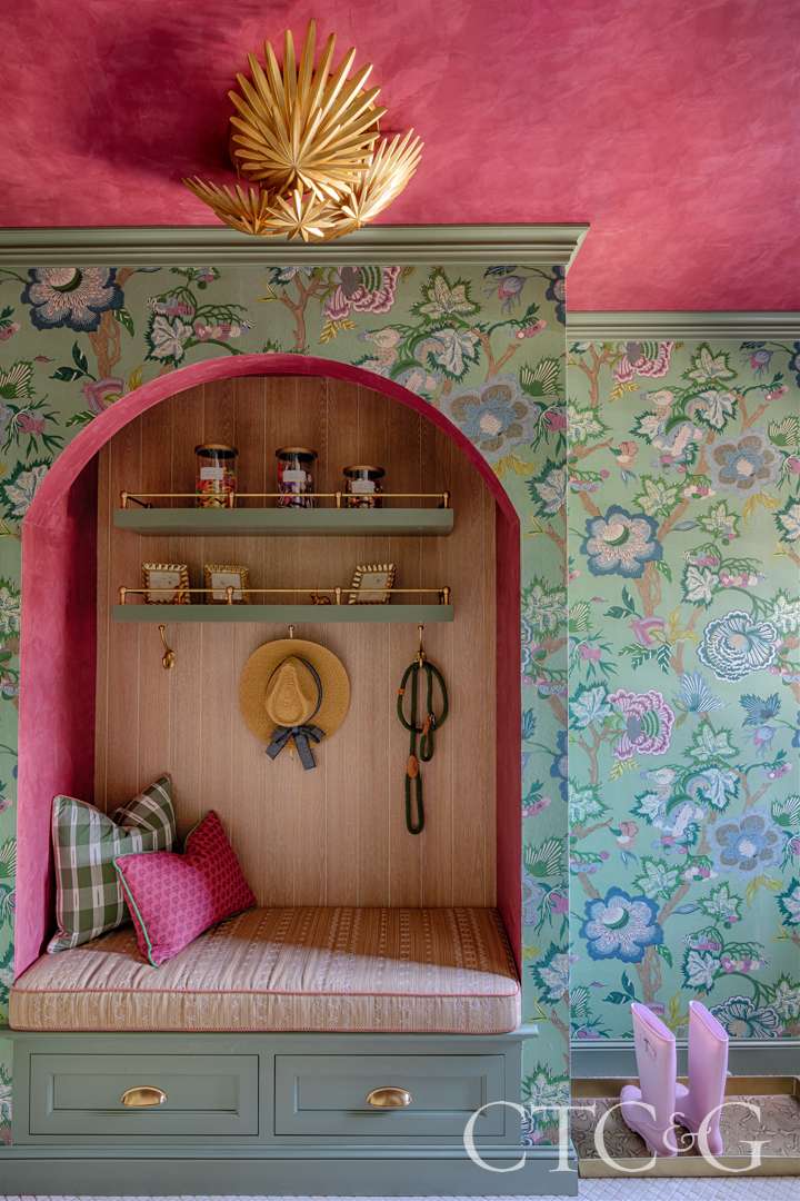 Lead designer of AMS, Martha Gargano, was initially brought on to design the showhouse’s mudroom and approached it with tasteful vibrance. Pink and green paisley wallpaper, magenta accents, gold finishes, and an endearing built-in bench with patterned pillows and drawers for storage foster an environment meant to make you smile. Playful and bold? Yes, but why not for a limitless design event like this? “Most clients are afraid of color, so it was so much fun to do this for the showhouse,” Gargano shares.