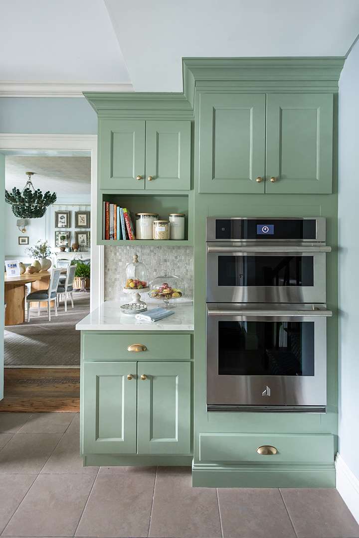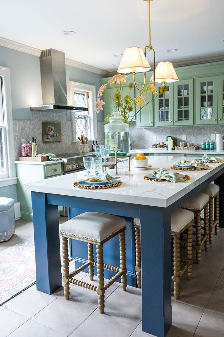 AMS was additionally asked to design the adjacent kitchen, and so weaving colors from the bubbly mudroom into that central space was a natural next step. Drawing on the home’s setting–there’s a gorgeous park right down the street and elegant landscaping out front–Gargano chose to continue the green palette, using blue as an accompanying color rather than pink.