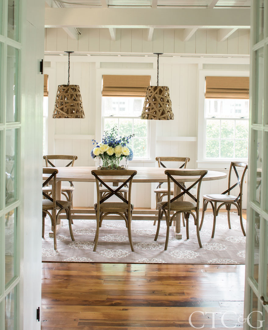 Dovetail Furniture chairs surround a trestle table designed by architect John Allee and made by Alfred Brown Cabinetry. The Madeline Weinrib rug is from ABC Carpet & Home; and the pendants are from Serena & Lily.