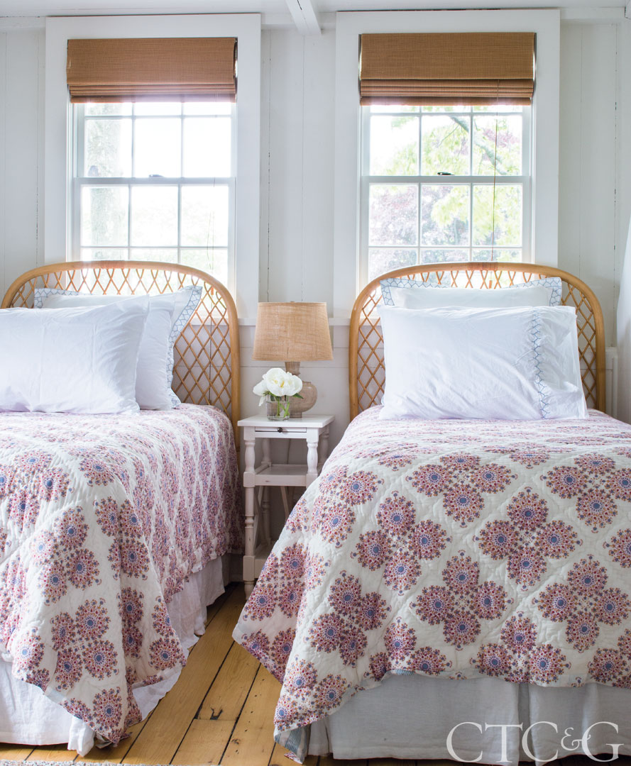 Vintage rattan headboards and John Robshaw bedding create cozy sleeping quarters in the guest room.