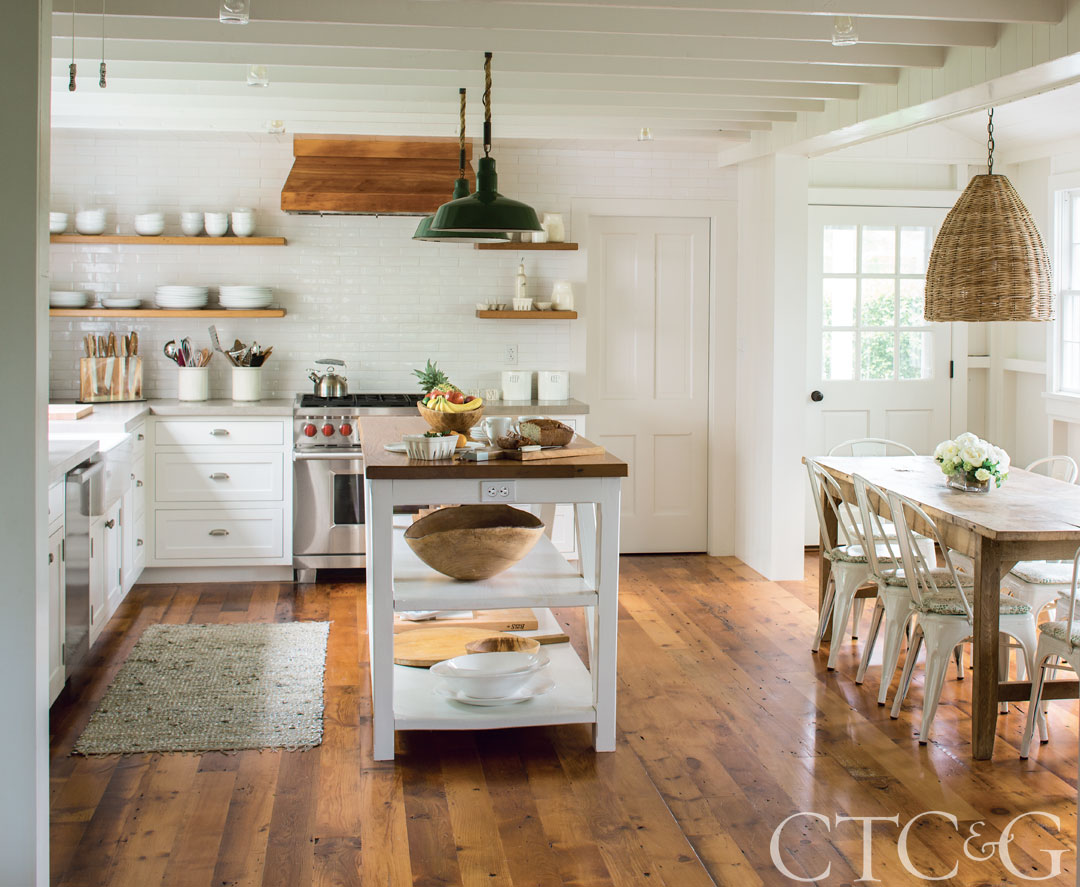 The kitchen island countertop, shelves and hood are made from the house’s original chestnut floors. The pendants over the island are vintage from Cisco Brothers. Table pendant is from Anthropologie. Chairs are from Blue Ocean Traders.