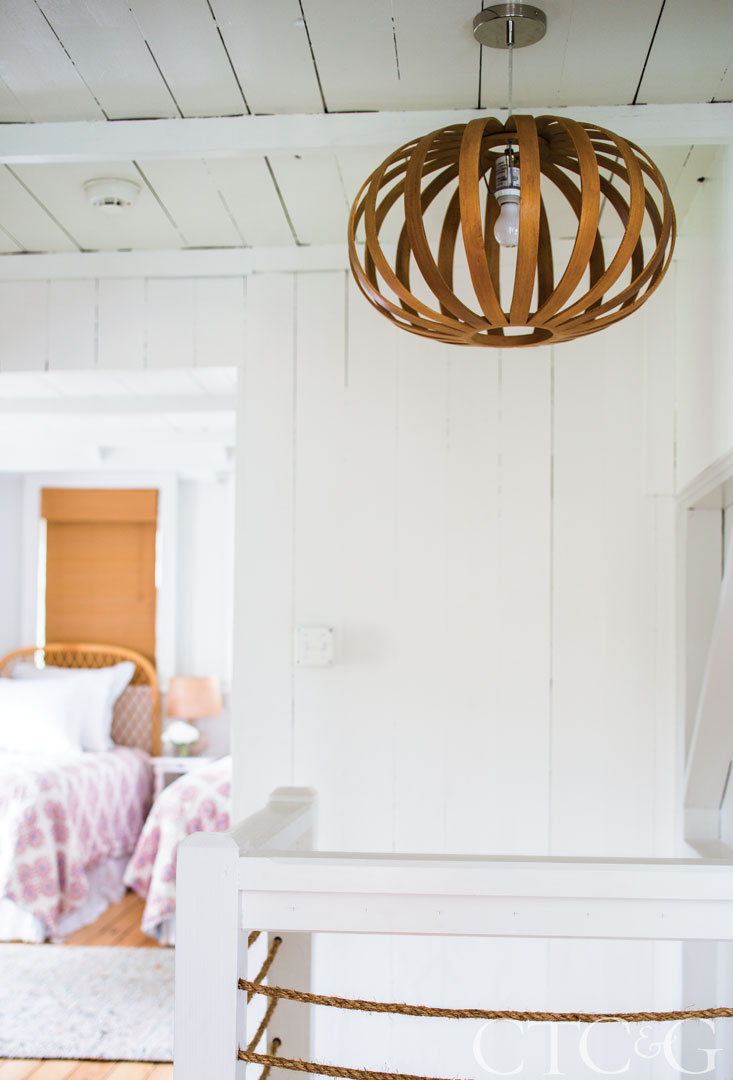 A funky wooden fixture from West Elm hangs at the top of the staircase.