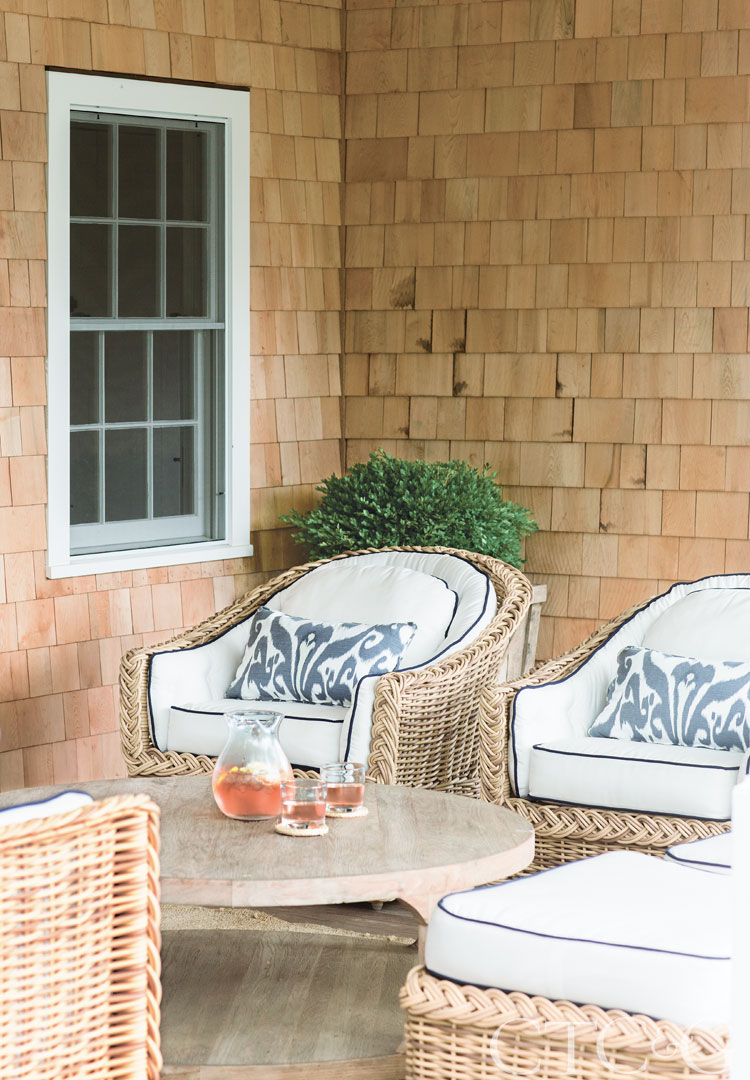 On the porch of a seasonal Niantic house, Wicker Works furniture with cushions upholstered in a Sunbrella fabric creates an inviting outdoor living space. Throw pillow fabric is Christopher Farr.