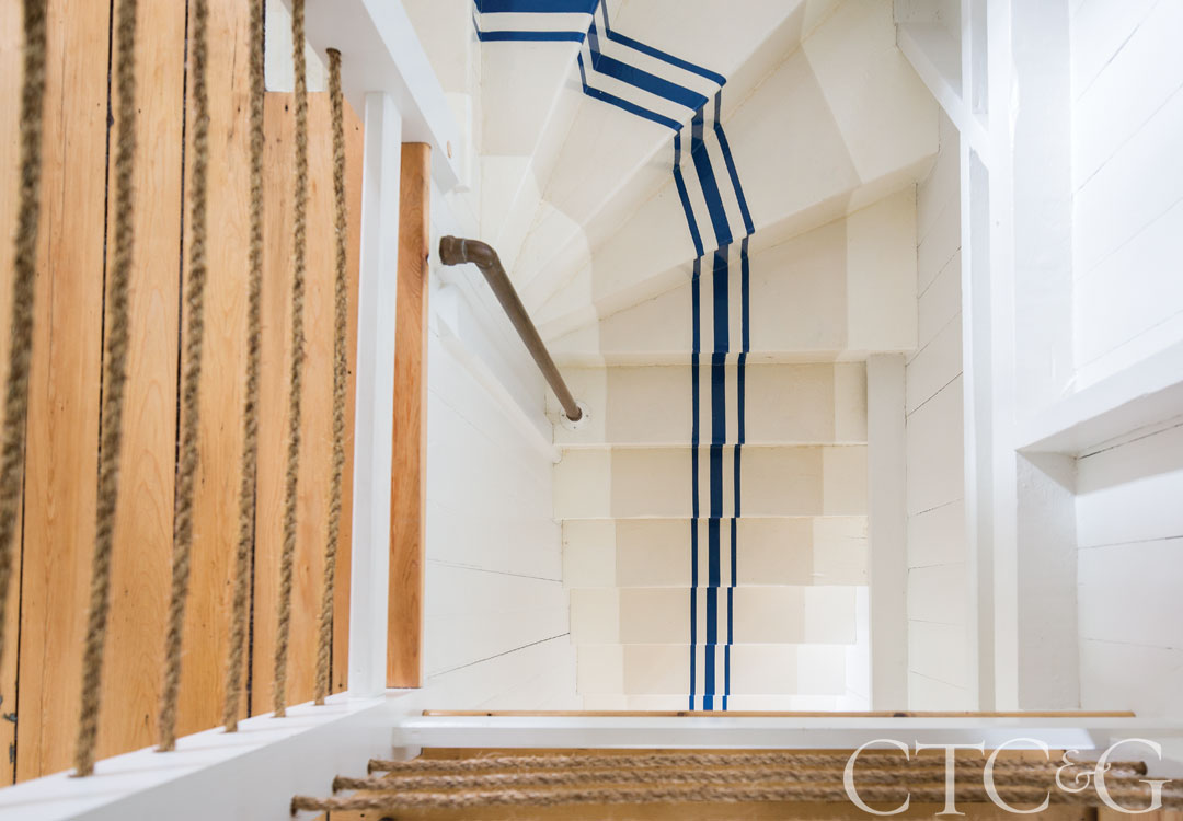A pinstripe painted on the staircase resembles a grain sack and was a painstakingly difficult process—thanks to the angle—to complete.