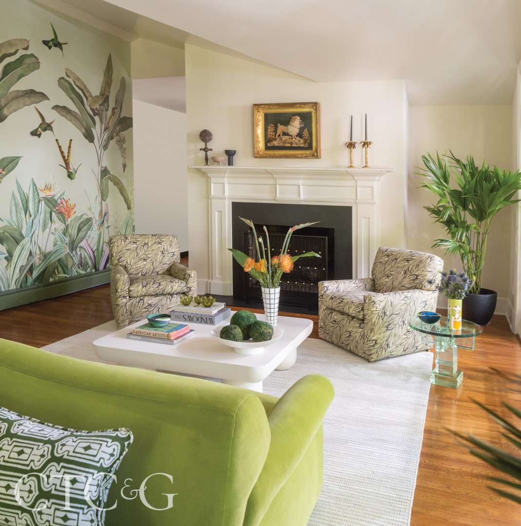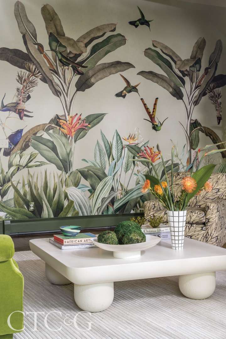 Our first step was to create a statement on a single wall in the white living room. The client fell in love with a bold South African wallpaper that was an extension of the green riverbed outside. From there, the rest of the room organically evolved.