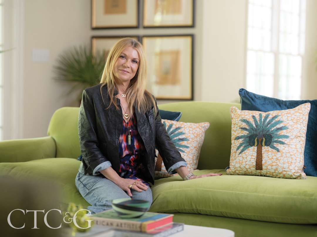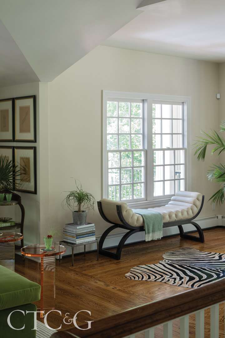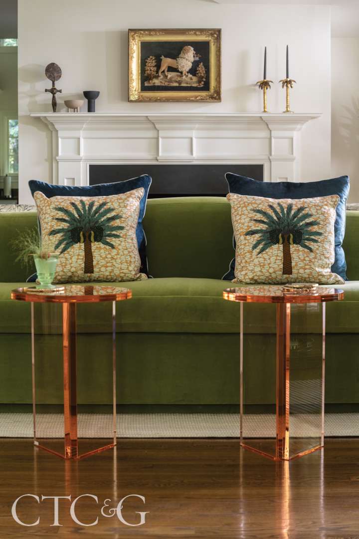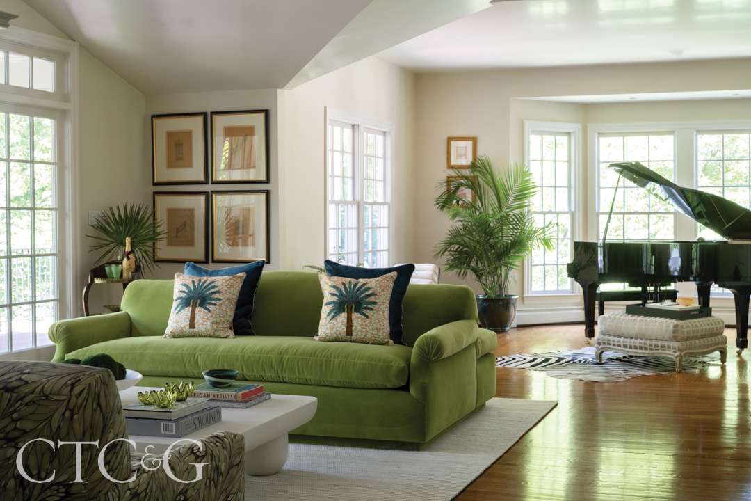 The client also craved color, but we had to temper that down so that we didn’t detract from the view outdoors. Choosing green as the dominant color was a perfect way to achieve this. Because the client had so many fabulous pieces that she had collected over the years, the room needed to be edited down. She had an amazing Vicente Wolf double-sided sofa, which she had for more than 30 years. We re-covered the sofa in this gorgeous Osborne & Little green velvet.