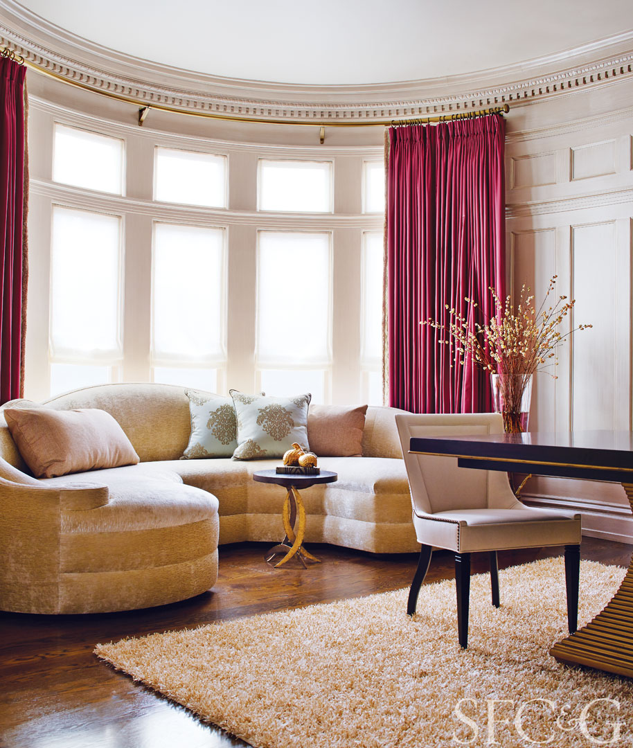 A curved sofa invites lounging in front of floor-to-ceiling windows. The cocktail table with dark, fumed oak top and brass sculptural base is from Donghia.