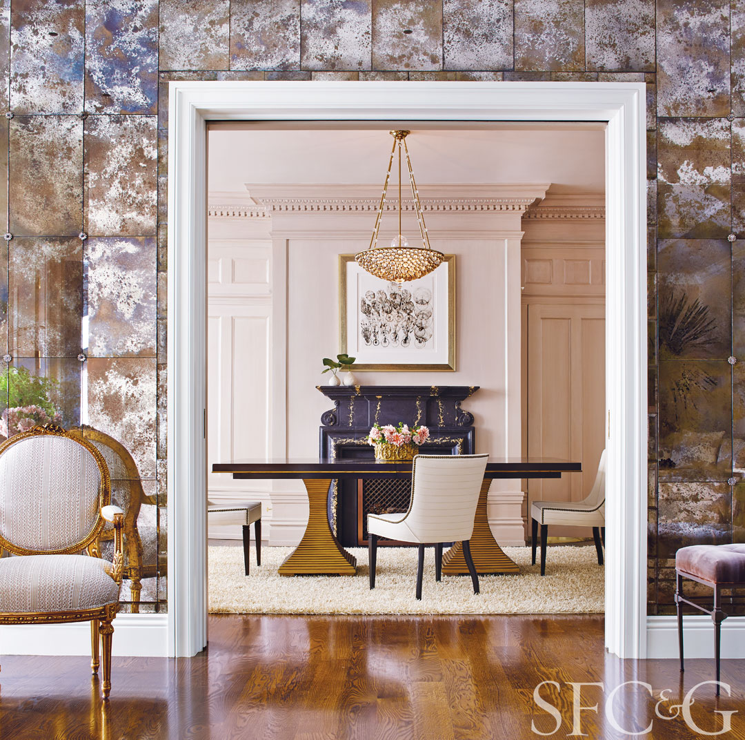 The entrance to the dining room is framed by a wall of antiqued mirrors and hidden pocket doors. Dining chairs from Studio William Hefner are upholstered in a Holly Hunt fabric from Kneedler | Fauchère and a Rose Tarlow fabric from Shears & Window. The double pedestal table is from Bernhardt. The Best & Loyd Oyster chandelier is from De Sousa Hughes.