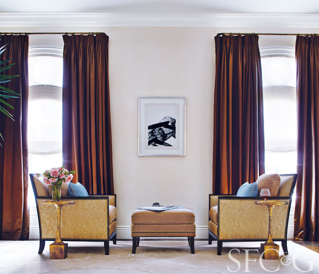 In the living room, Bernhardt armchairs wear Nancy Corzine damask jacquard fabric; cushions are in a Rodolph mohair from Sloan Miyasato. Cast iron accent tables in a gold leaf finish are from Global Views.