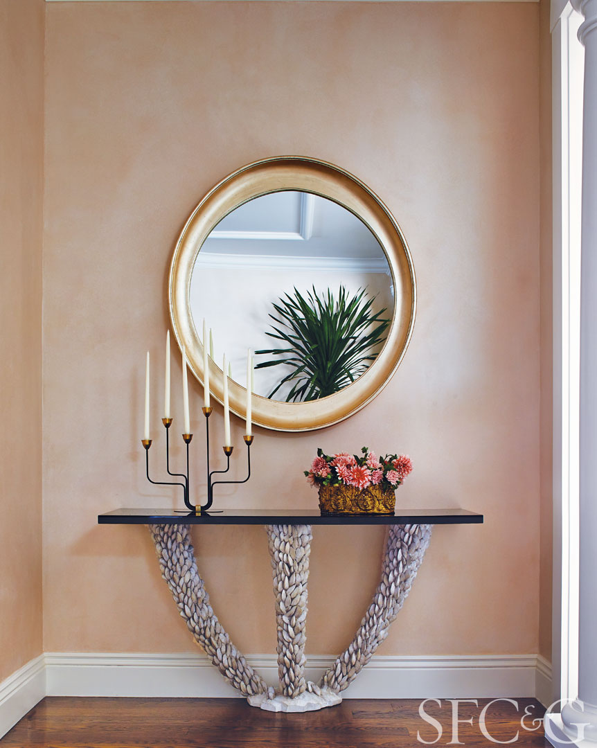 Porta Romana console tables from Donghia flank the living room fireplace. Custom oval mirror is from Antonio’s Antiques.