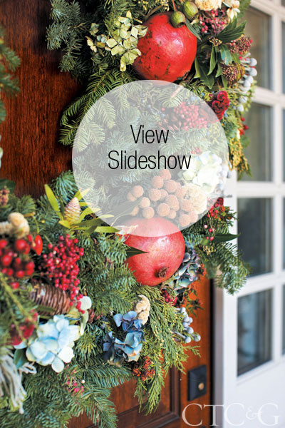 Throughout the home, nature-inspired trimmings by Cyrus Paktinat of the Flowerfall of Westport were the perfect complement to the stone and shingle house. Known for work he had done for Mollie at the historical society, Paktinat came recommended through friends as well. After discussing general themes and designs, the homeowners gave him free rein. “I love flowers and have them in my house all the time, but I knew that Cyrus needed to create for us. His work is gorgeous,” says Donovan. “He even did some things that we could keep beyond the holidays. The mantel flowers have dried: We still have them on the living room and cottage mantels.”