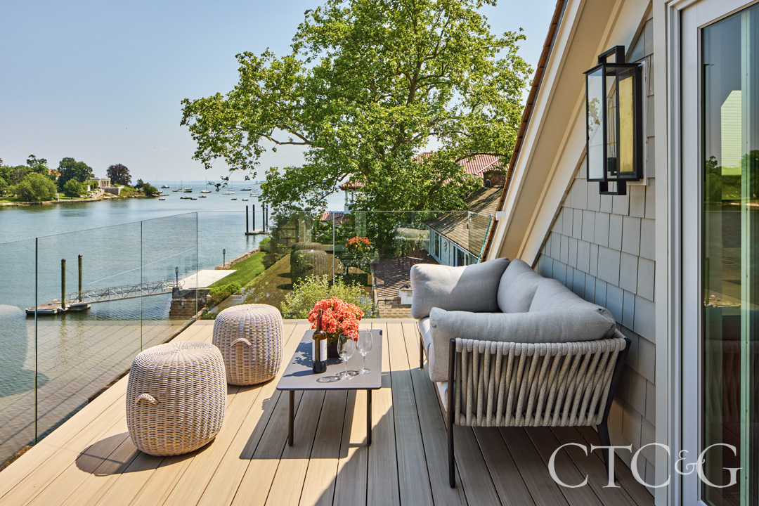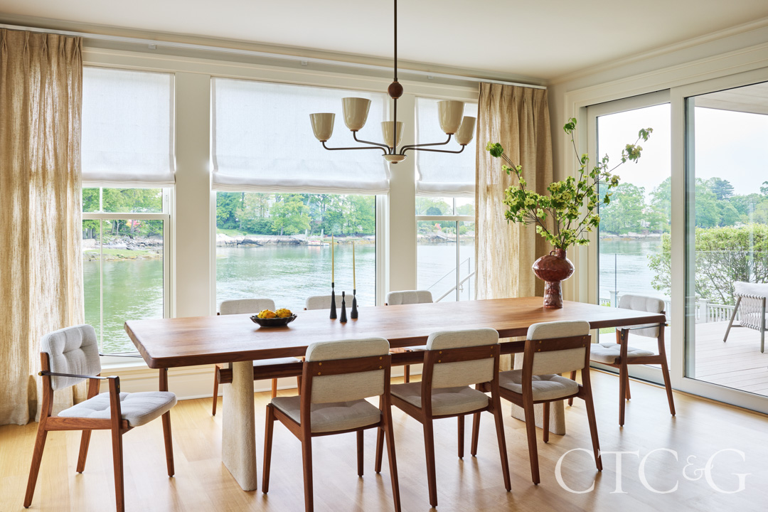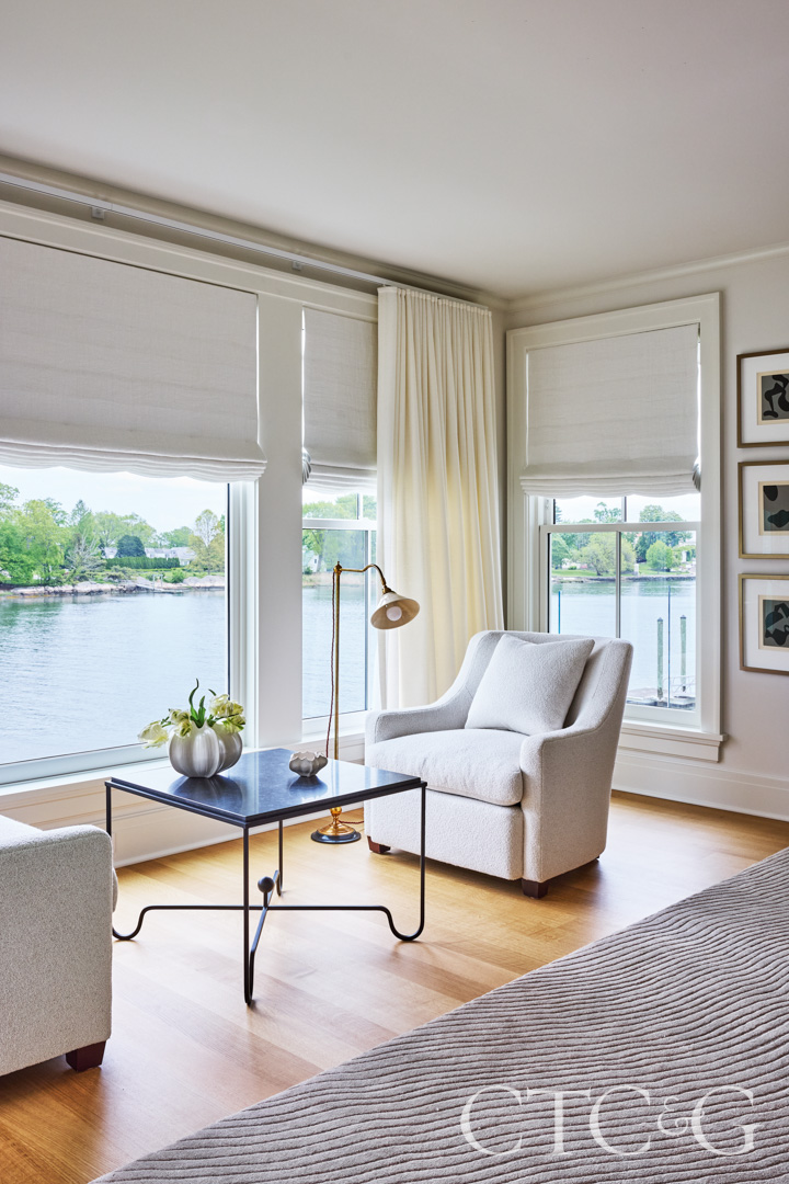 While Larson ensured that every room—public and private—took advantage of extraordinary Sound views, inside Rome made maximum use of every cornered window, picture window and terrace. In the kitchen, she wrapped a corner with a beige banquette and positioned the spacious marbled island so that when prepping a meal, water views were front and center. A two-seat nook in the primary suite aligns with the inlet water.