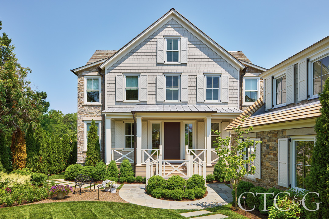 Architectural designer Judy Larson likes it when she sees people walking or driving along a street who suddenly pause to take in a house. She imagines them likely wondering when the structure was built and whether what they’re seeing is the original house as it was when first completed. So, when she and her husband, who own and run Gardiner & Larson Homes, were commissioned by clients in Greenwich to design a new house on a waterfront site, she wanted to create something wholly original, while also creating a little mystery from the street about whether the dwelling was new or old or a combination of both.