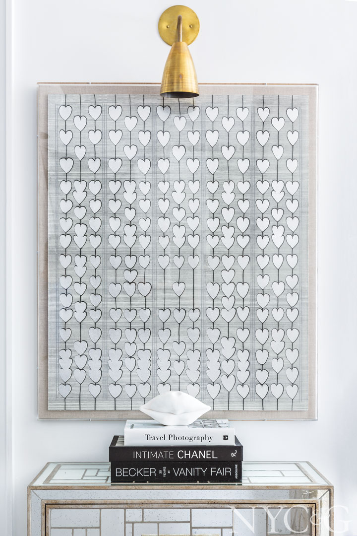 A silver-leaf artwork hangs in the entry; the brass sconce is from Onefortythree.