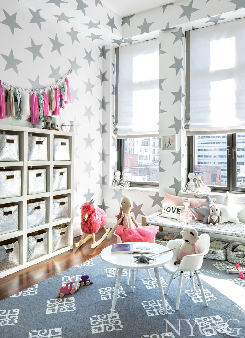 Sissy+Marley’s Lucky Star paper in Silver covers the walls in daughter Hermione’s playroom. Metallic bins from Serena & Lily sit in a West Elm shelving unit; the dhurrie is from Calypso St. Barth.