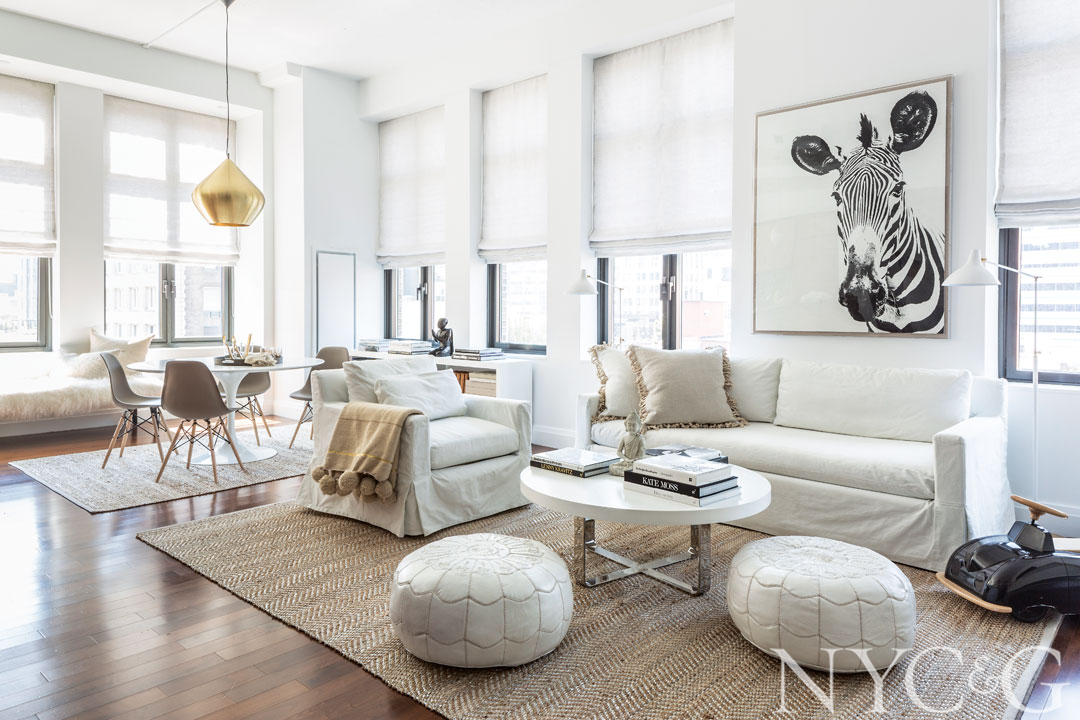 In the living room, a SoHo cocktail table from Desiron is surrounded by Serena & Lily poufs and a cotton- slipcovered sofa and armchair from Restoration Hardware. The black-and-white zebra print is from Natural Curiosities. A Tom Dixon brushed-brass pendant hangs above a Saarinen table and Eames dining chairs from Design Within Reach.