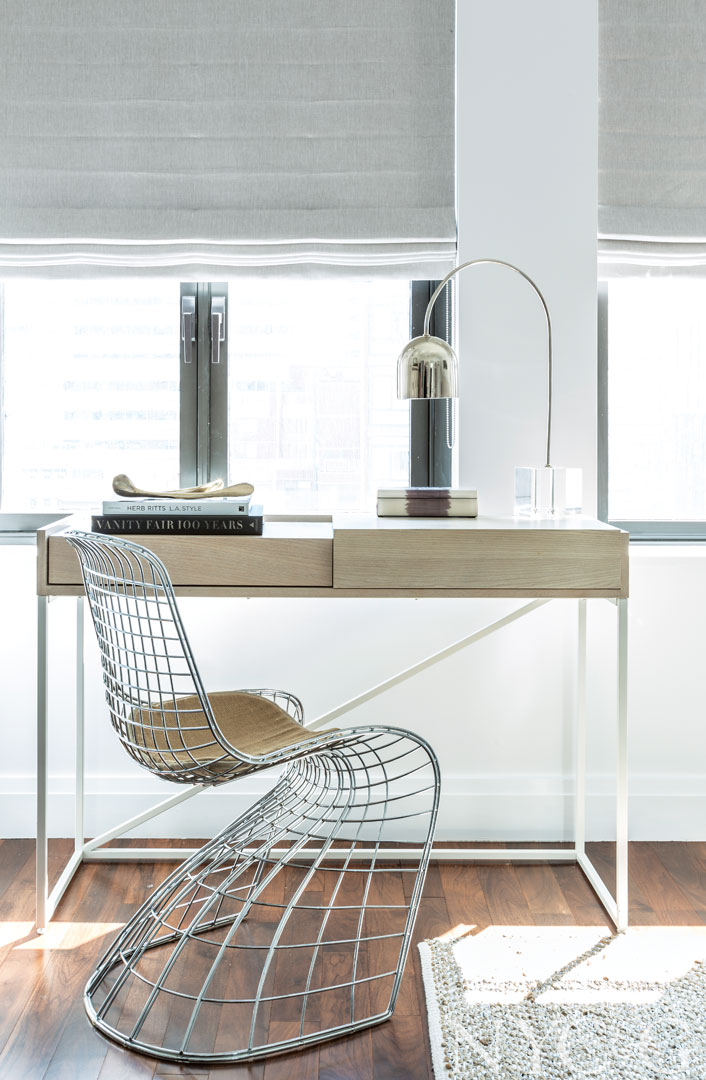 In the master bedroom, a chromed-steel Neo chair from Jayson Home sits at a whitewashed ash desk from Blu Dot.