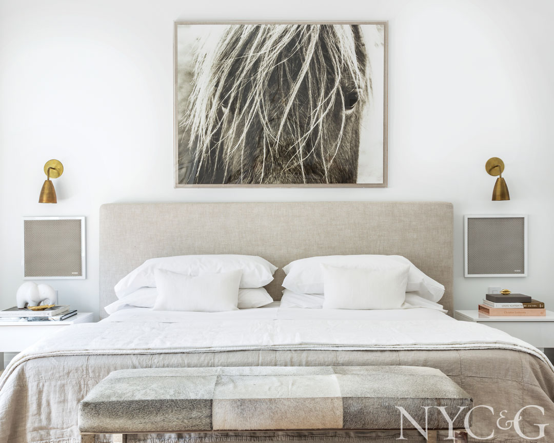 Hyden Horses-Blonde, a photograph from Natural Curiosities, hangs above a linen-wrapped headboard from Restoration Hardware. The Crosshair Hide bench is from Wisteria.